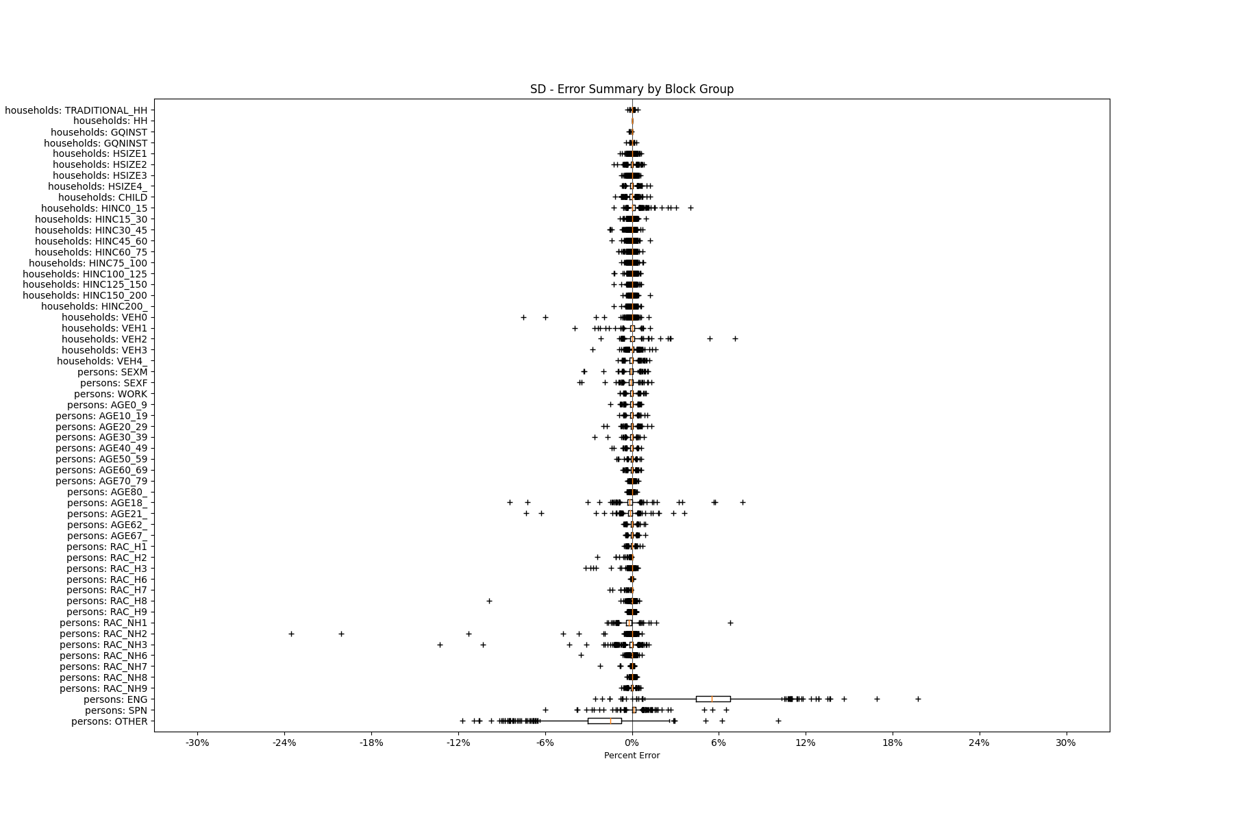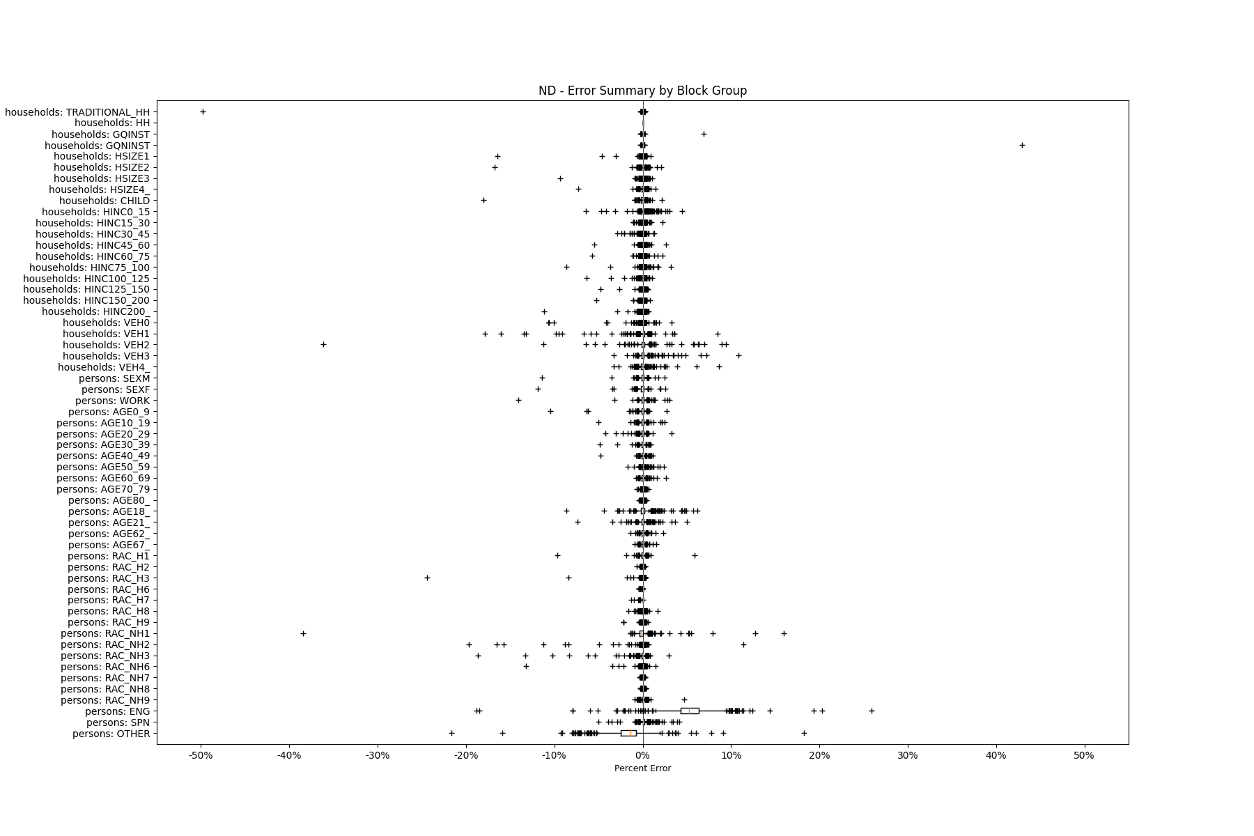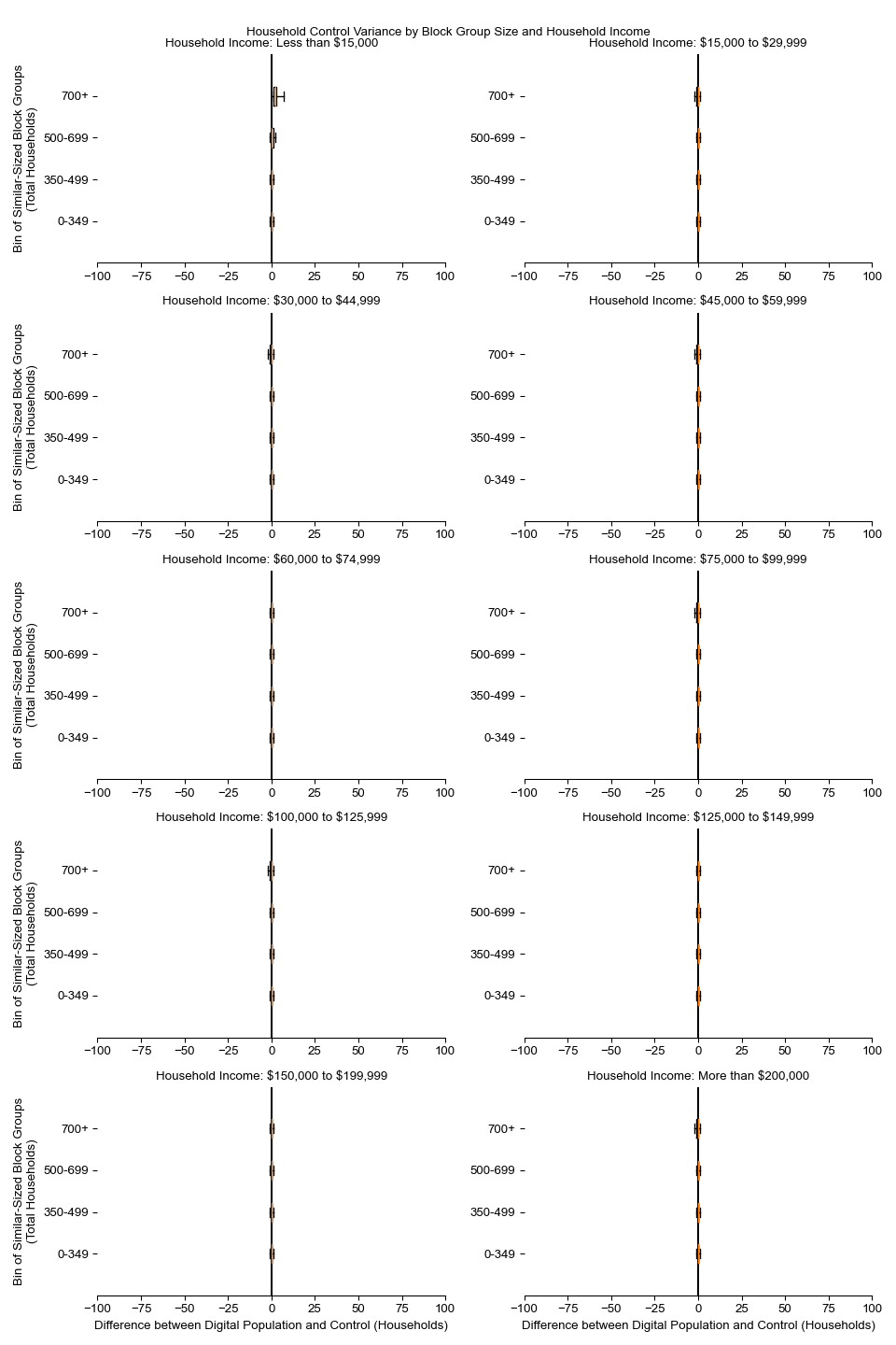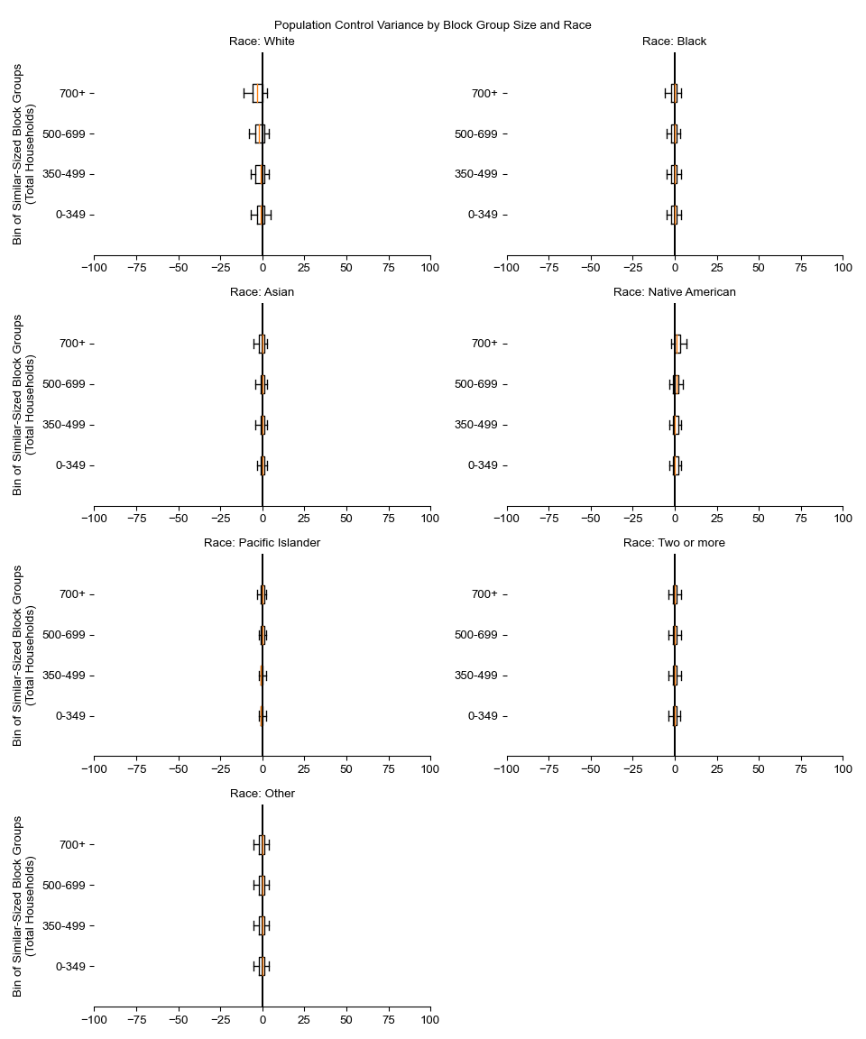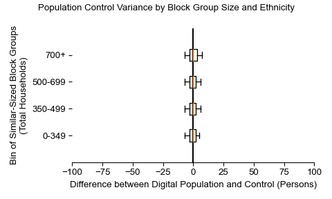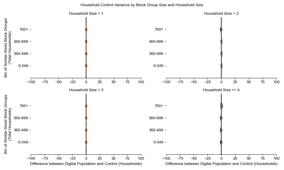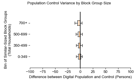 Along the horizontal axis in the plots, the distribution of the difference over the block groups between the digital total and control total is shown using a boxplot. One on this scale is a difference of one person (or household) between the control total and the digital population total. For example, block group A has a control total of 100 people and the digital population has 99 people. The ends of the horizontal lines out from the box show the 5th and 95th percentiles.