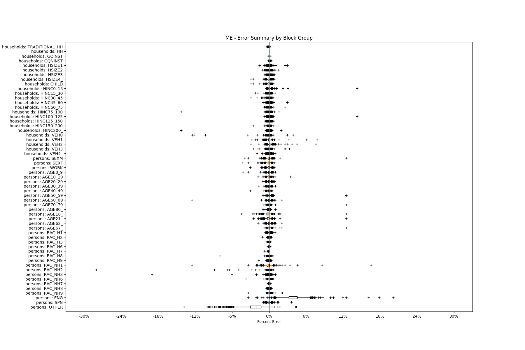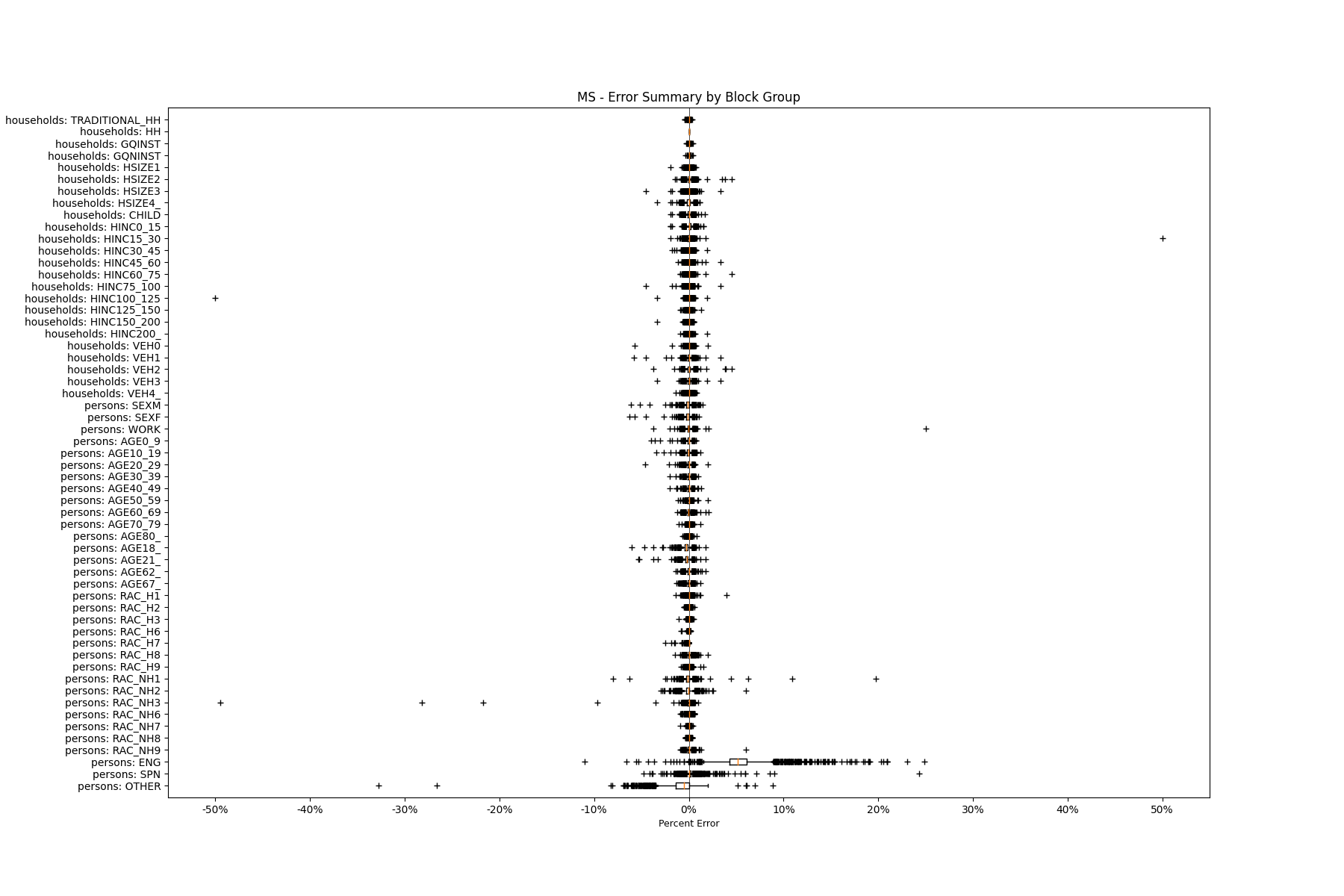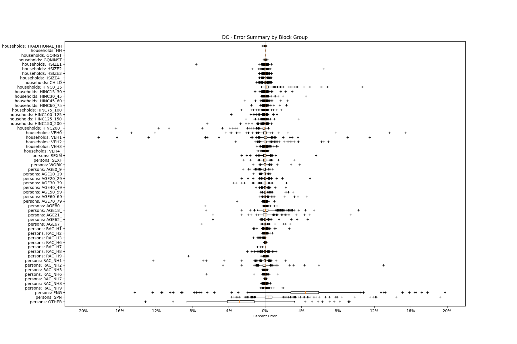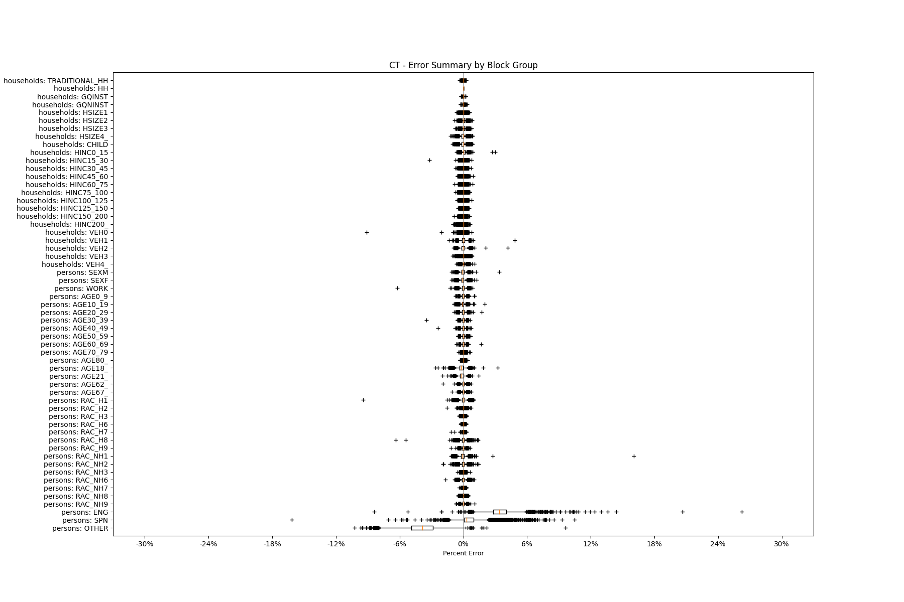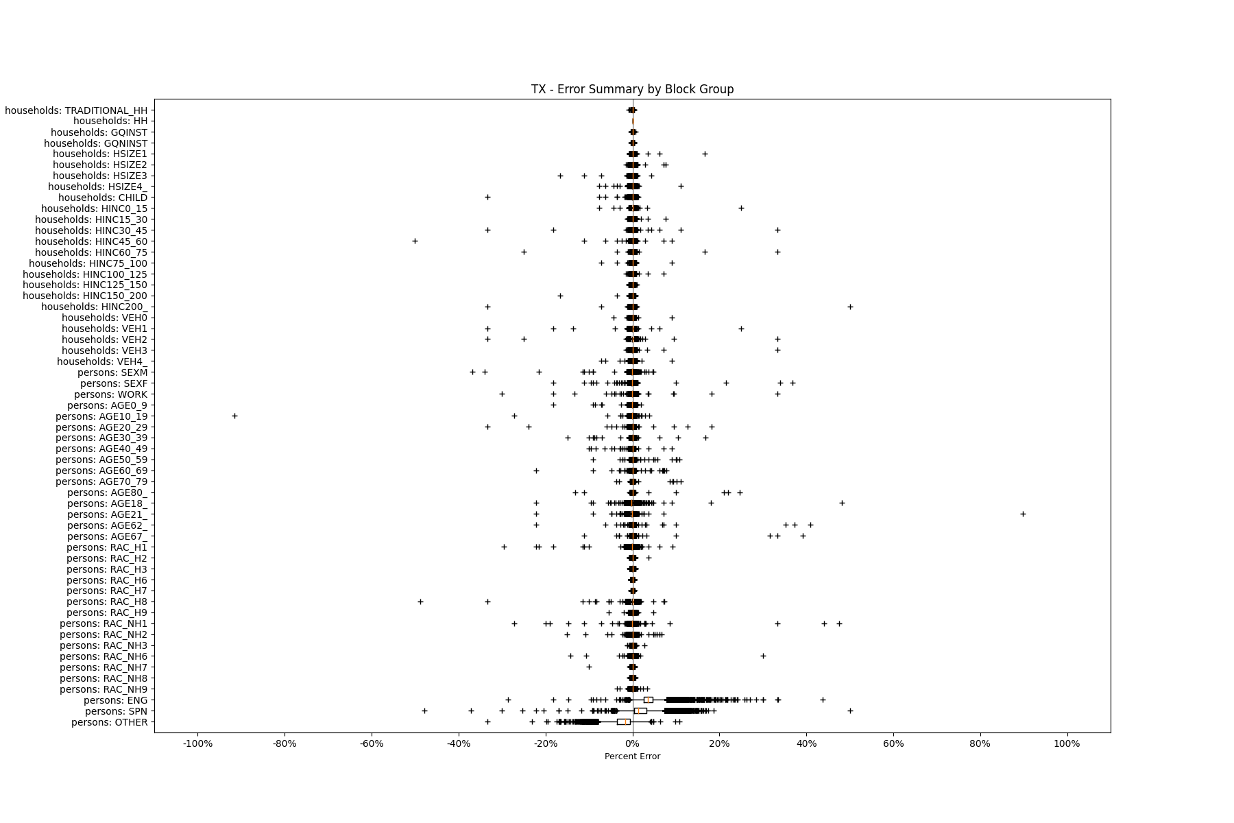 Along the horizontal axis in the plots, the distribution of the difference over the block groups between the digital total and control total is shown using a boxplot. One on this scale is a difference of one person (or household) between the control total and the digital population total. For example, block group A has a control total of 100 people and the digital population has 99 people. The ends of the horizontal lines out from the box show the 5th and 95th percentiles.