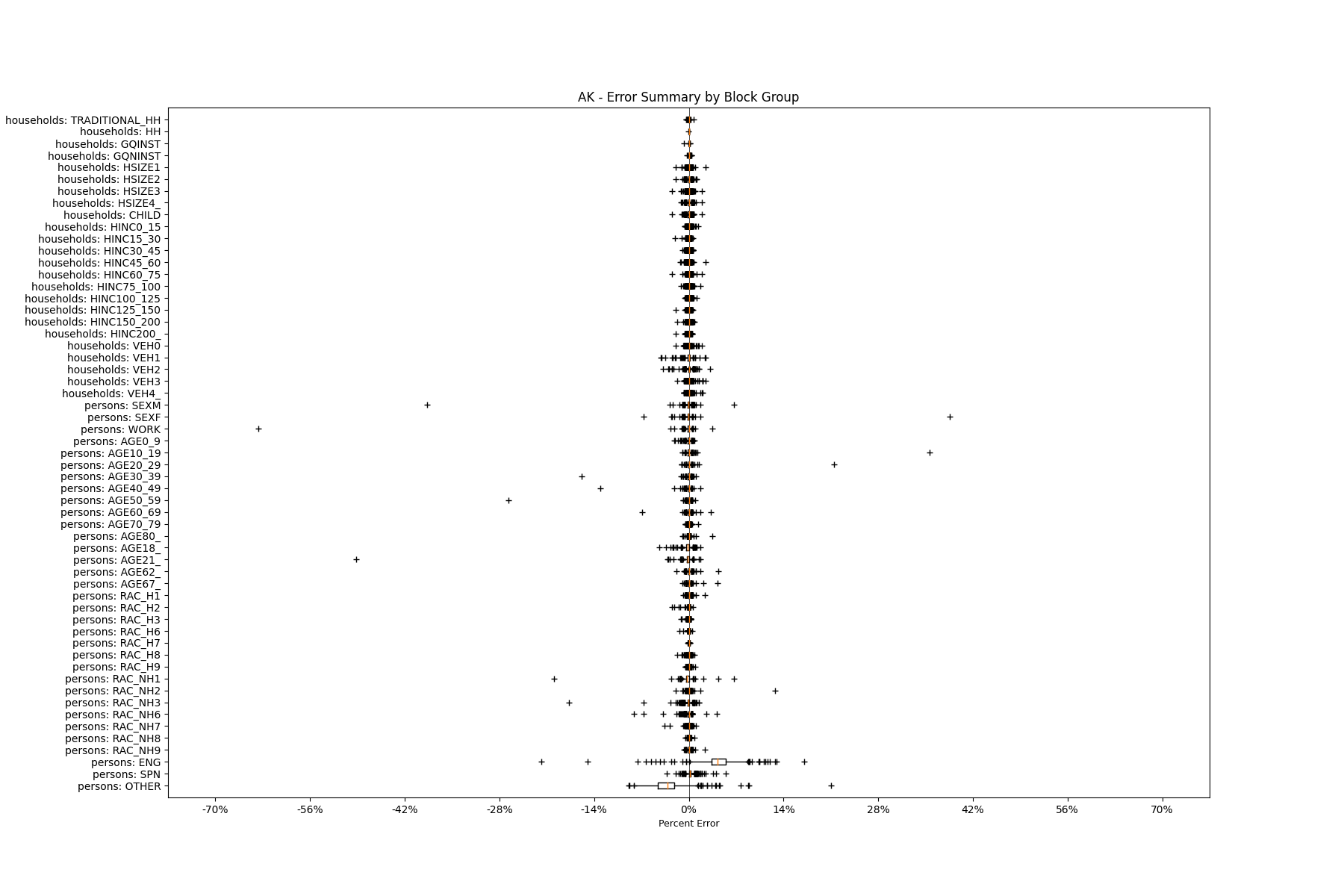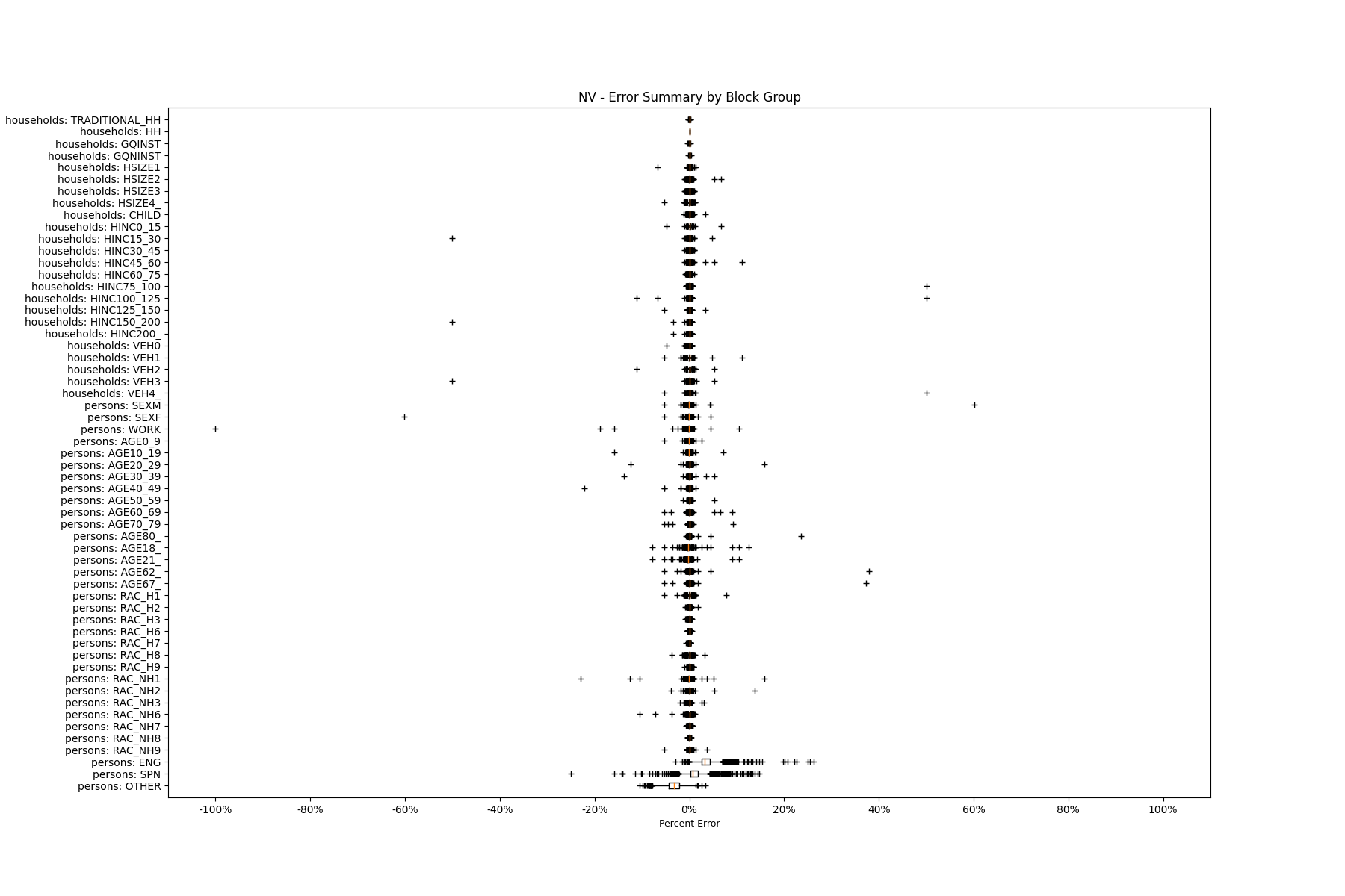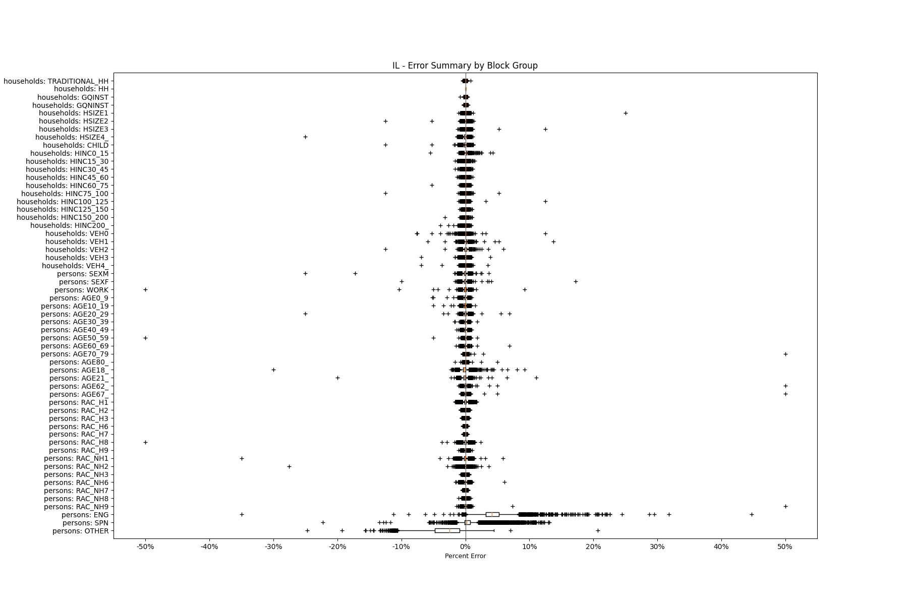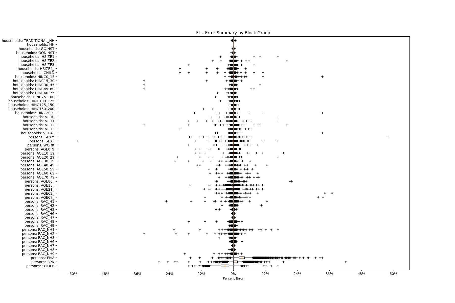 Along the horizontal axis in the plots, the distribution of the difference over the block groups between the digital total and control total is shown using a boxplot. One on this scale is a difference of one person (or household) between the control total and the digital population total. For example, block group A has a control total of 100 people and the digital population has 99 people. The ends of the horizontal lines out from the box show the 5th and 95th percentiles.