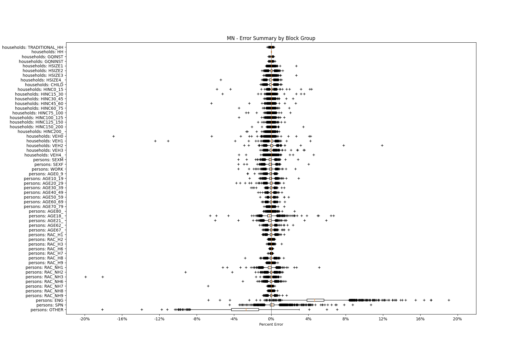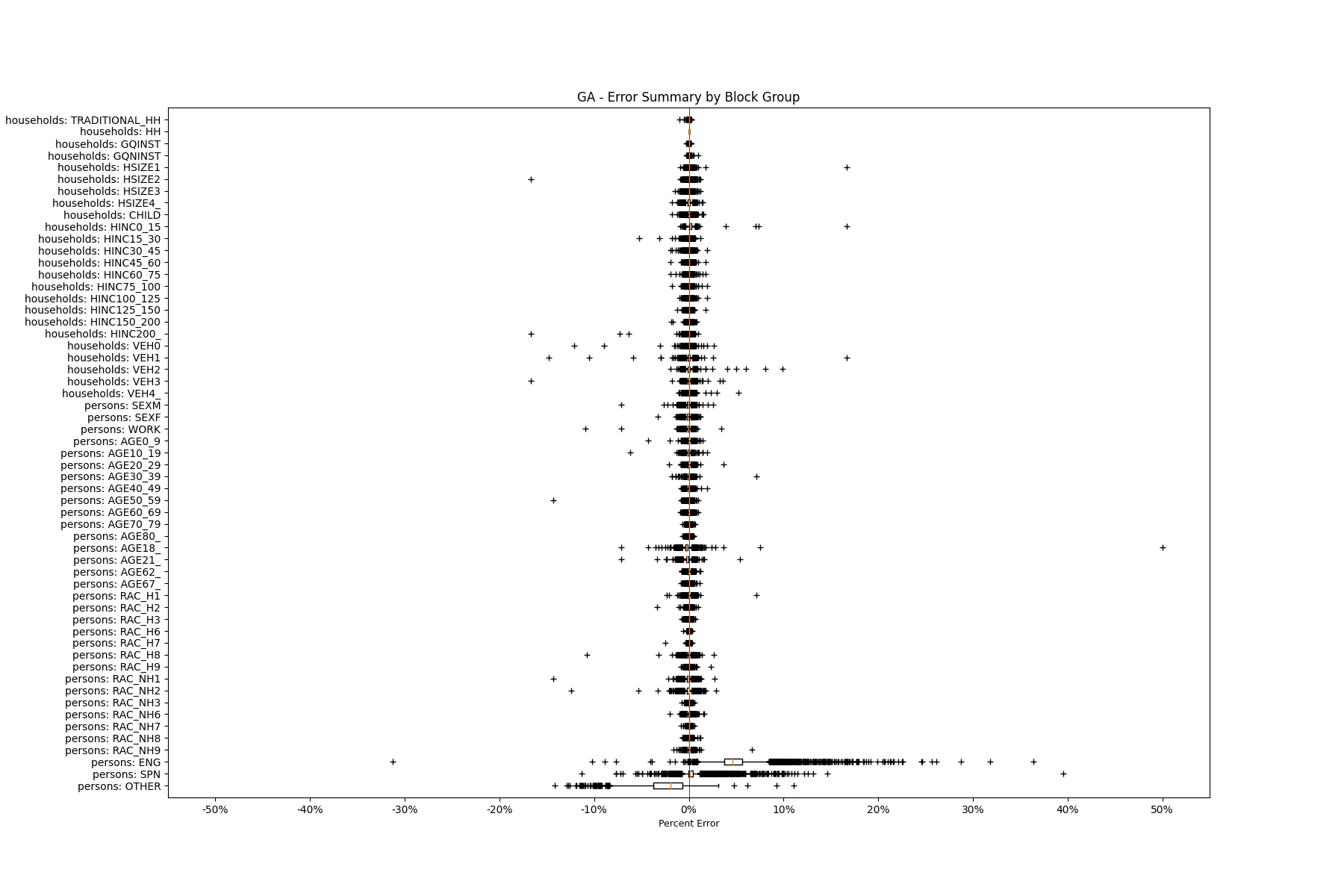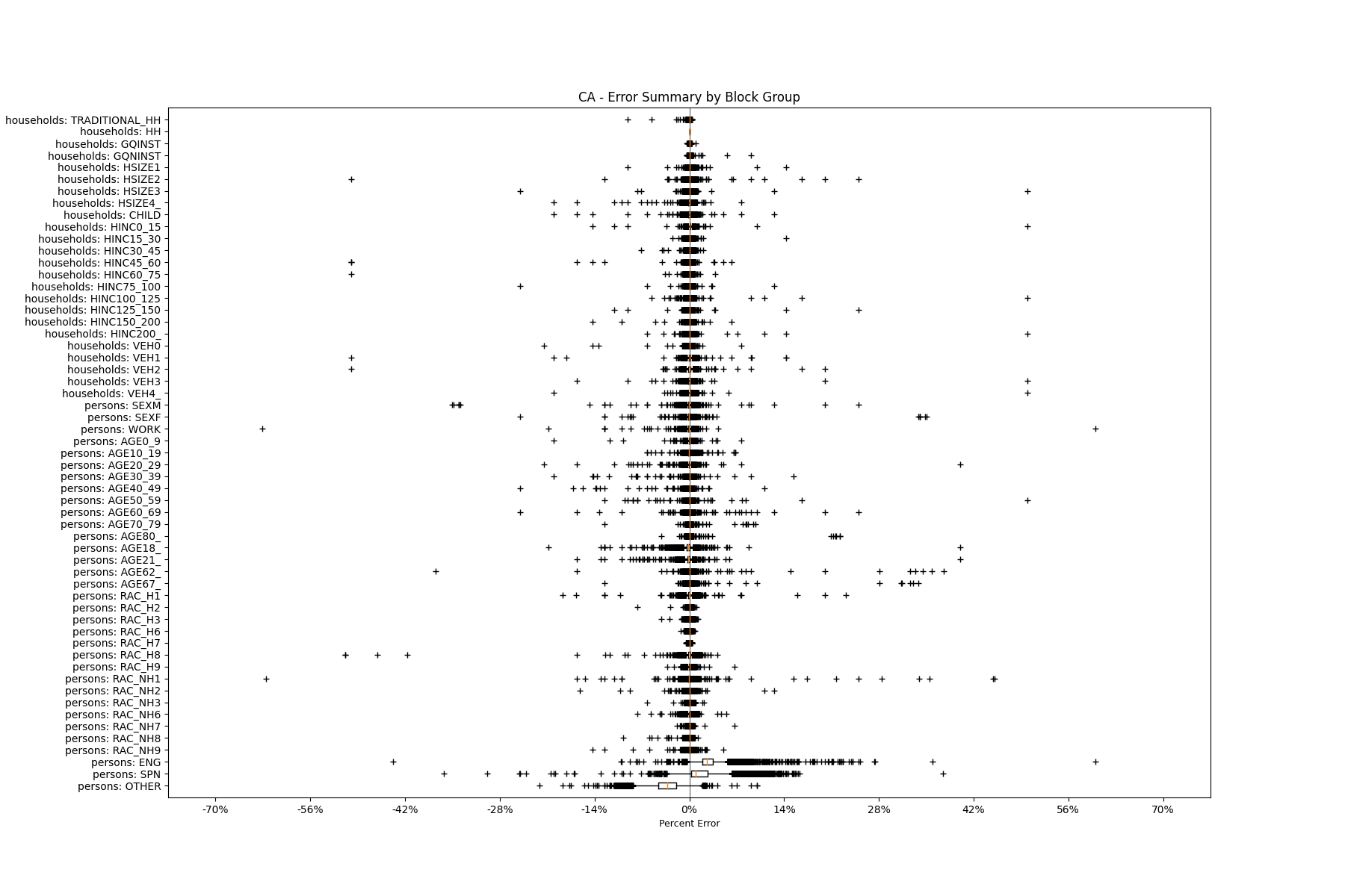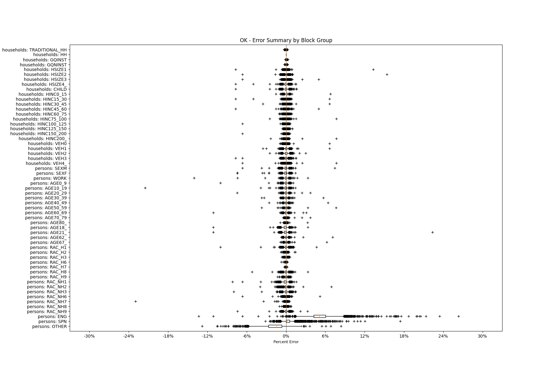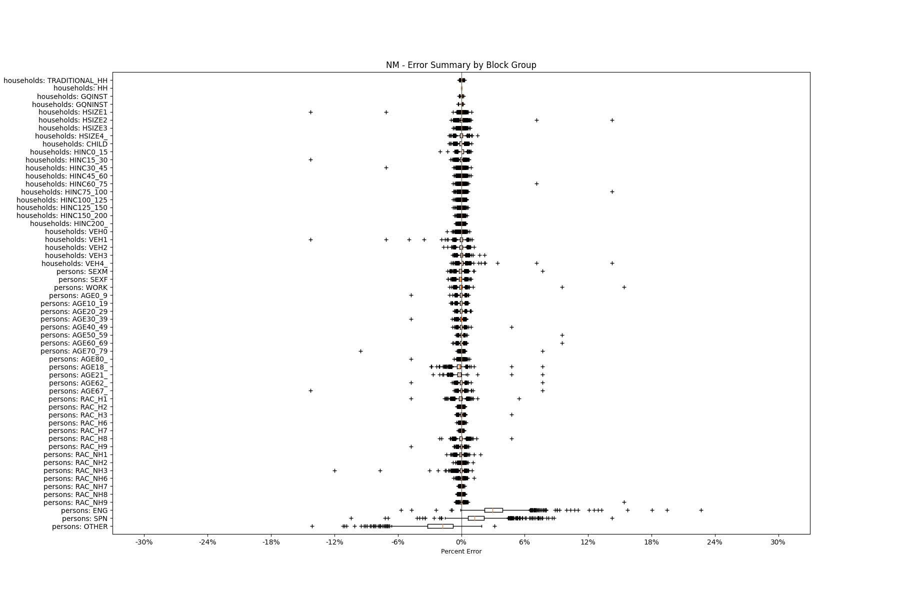 Along the horizontal axis in the plots, the distribution of the difference over the block groups between the digital total and control total is shown using a boxplot. One on this scale is a difference of one person (or household) between the control total and the digital population total. For example, block group A has a control total of 100 people and the digital population has 99 people. The ends of the horizontal lines out from the box show the 5th and 95th percentiles.