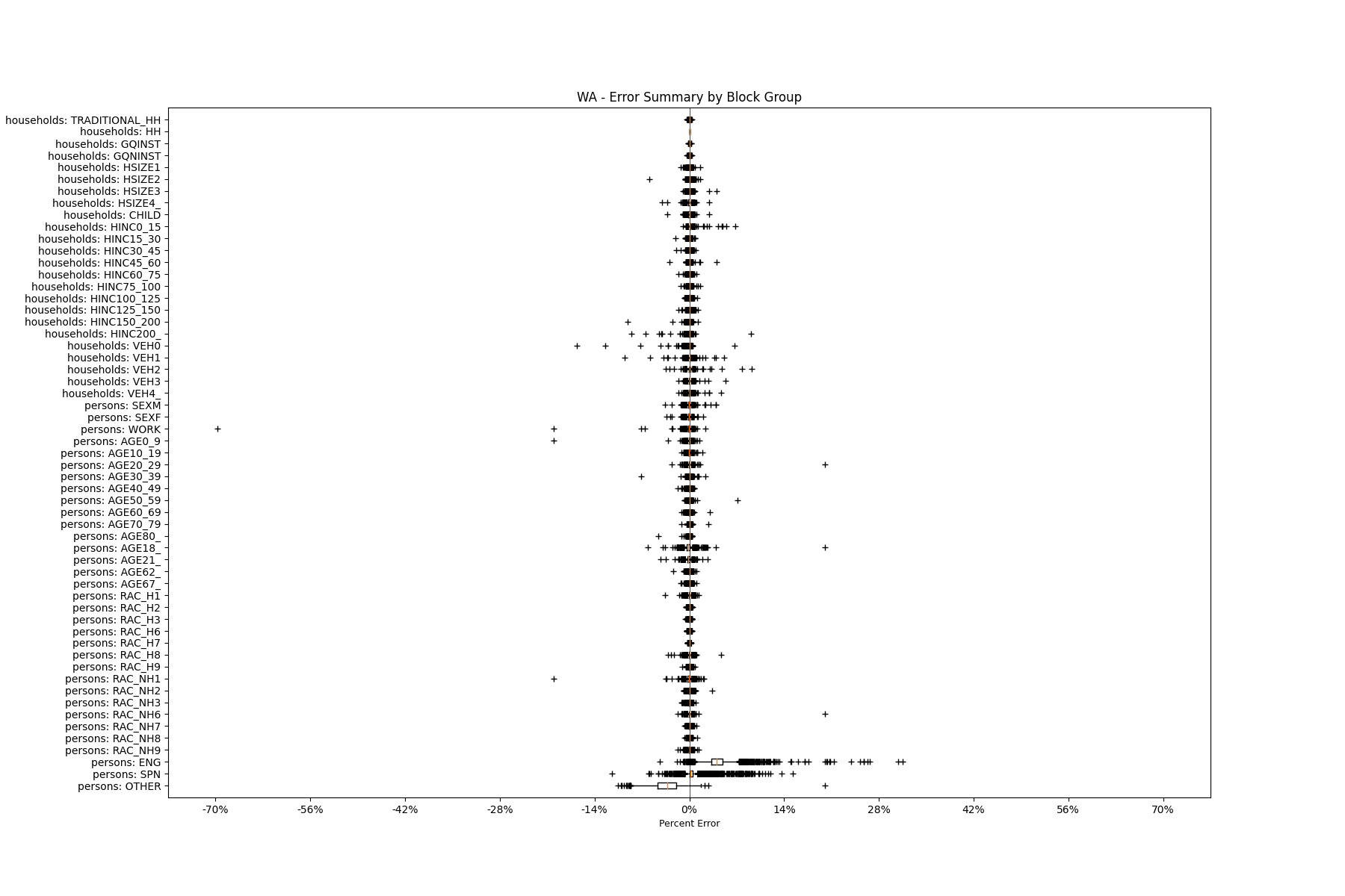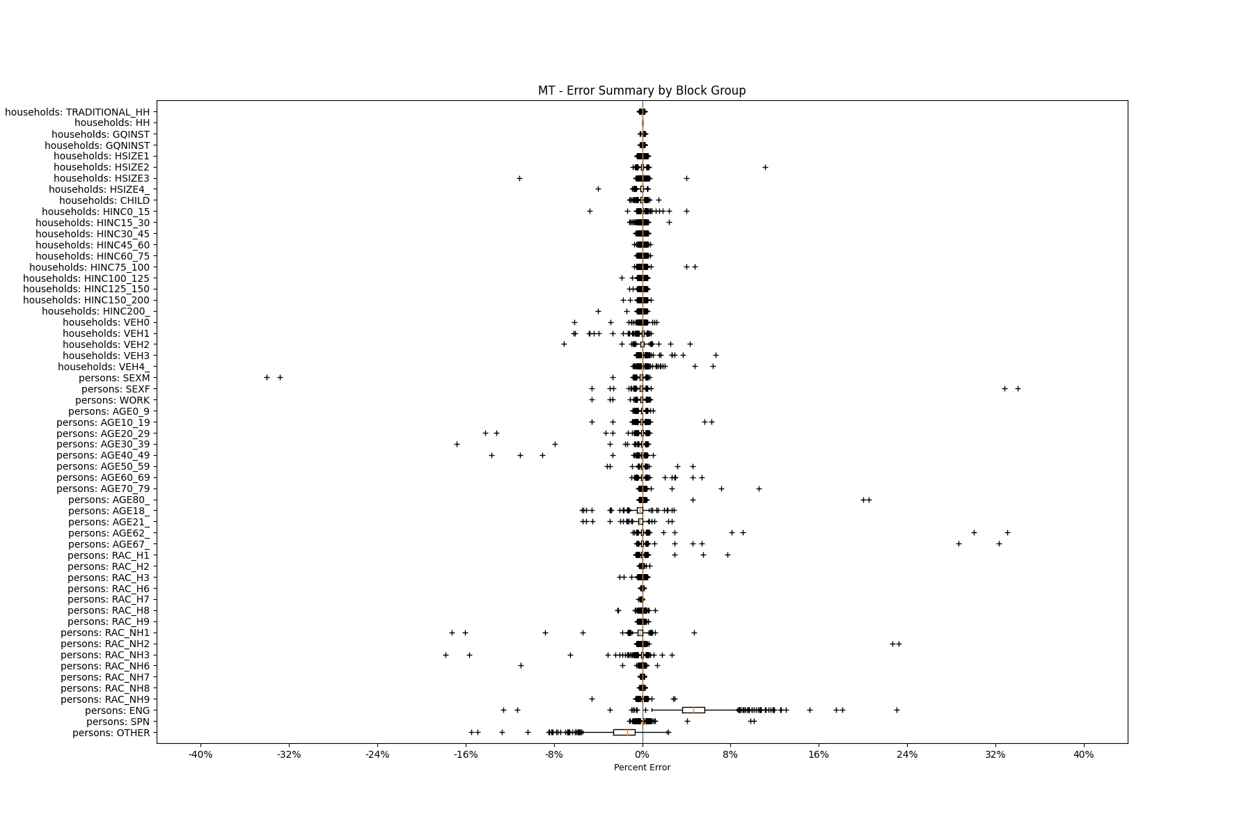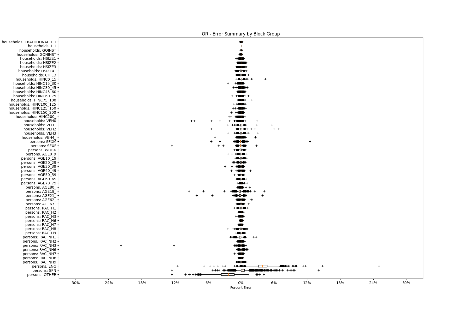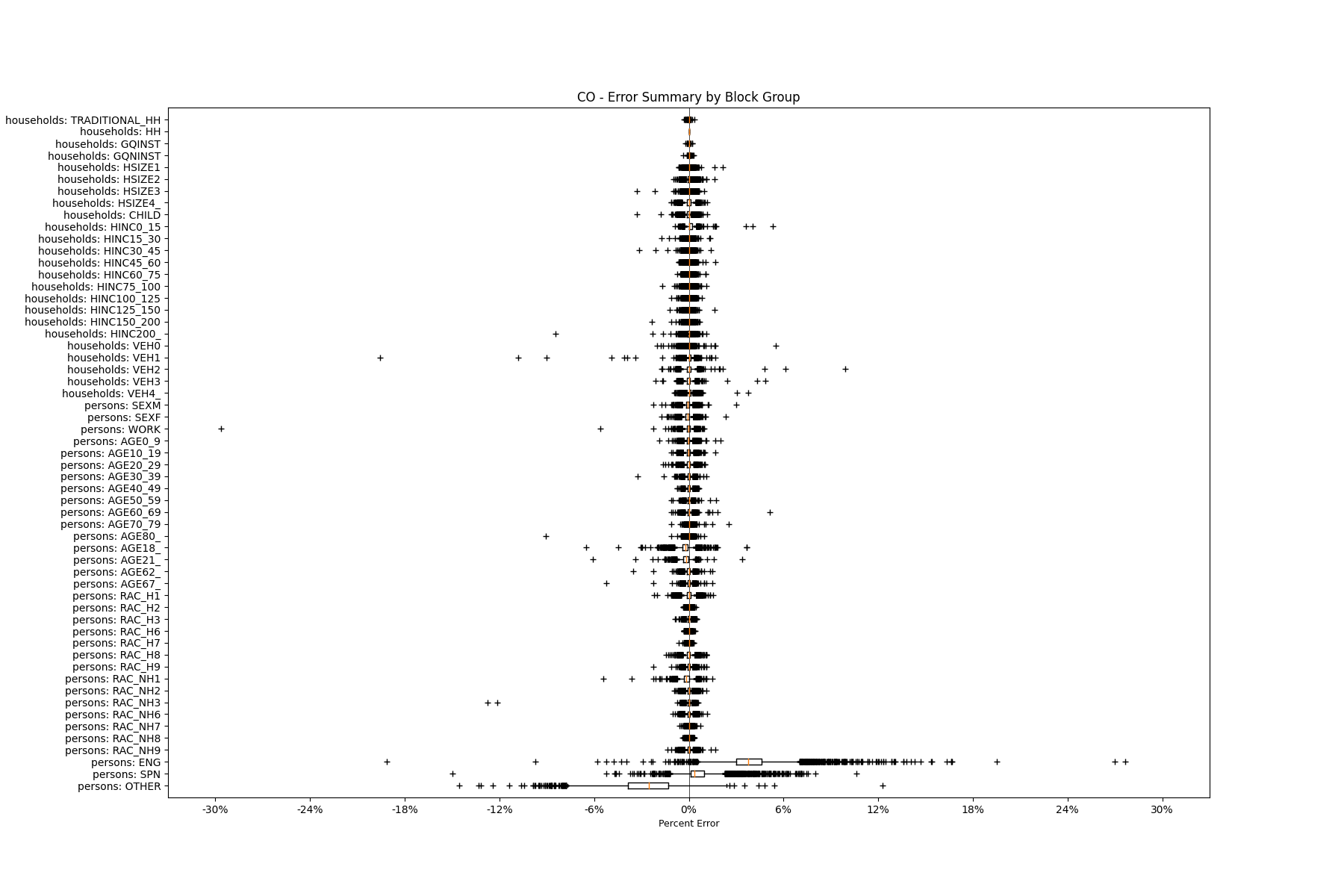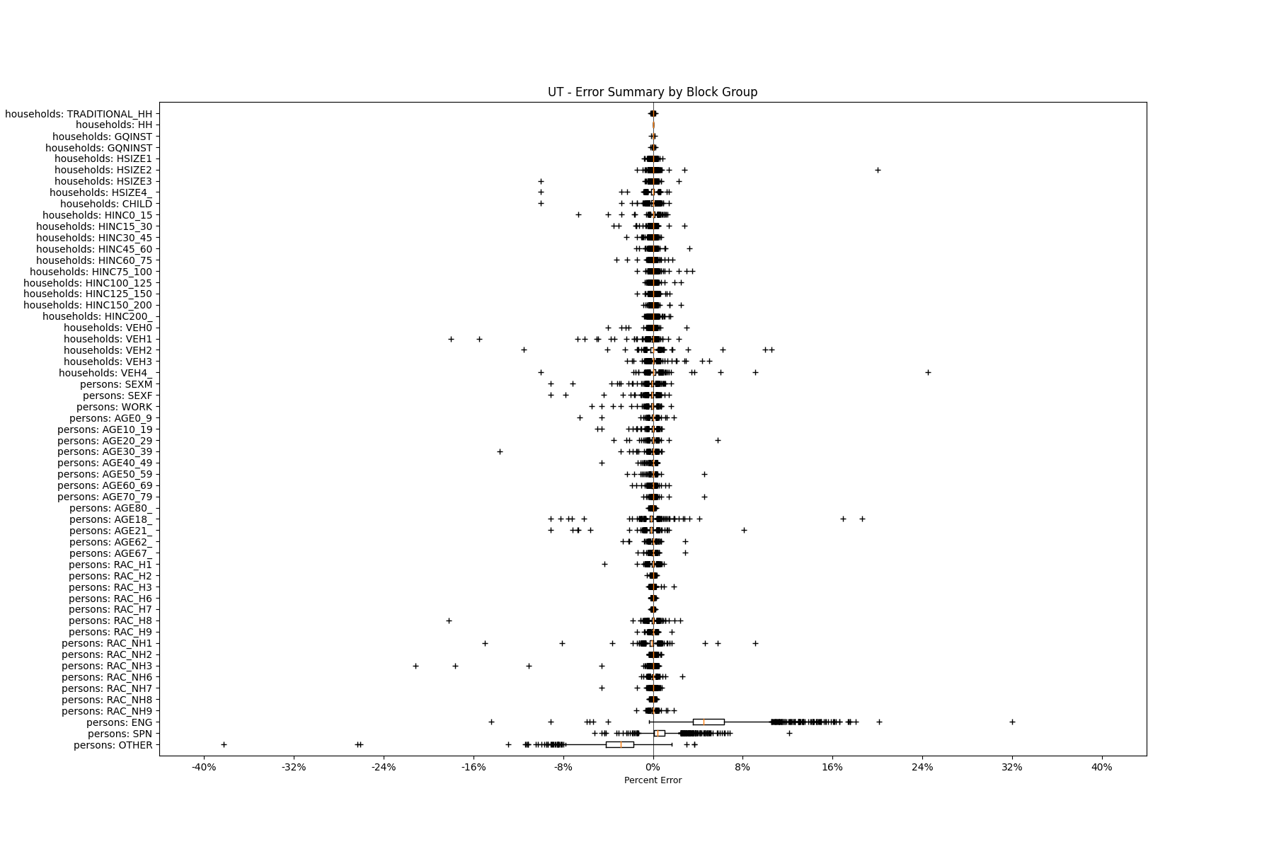 Along the horizontal axis in the plots, the distribution of the difference over the block groups between the digital total and control total is shown using a boxplot. One on this scale is a difference of one person (or household) between the control total and the digital population total. For example, block group A has a control total of 100 people and the digital population has 99 people. The ends of the horizontal lines out from the box show the 5th and 95th percentiles.