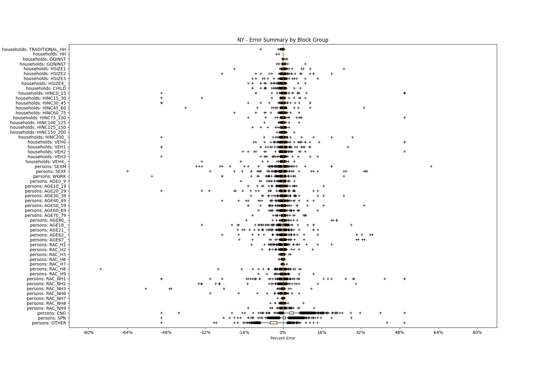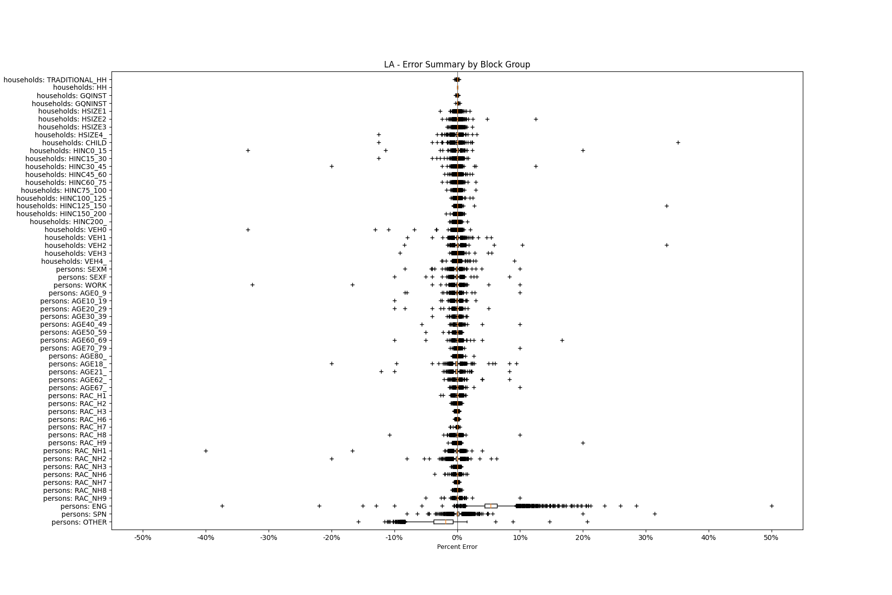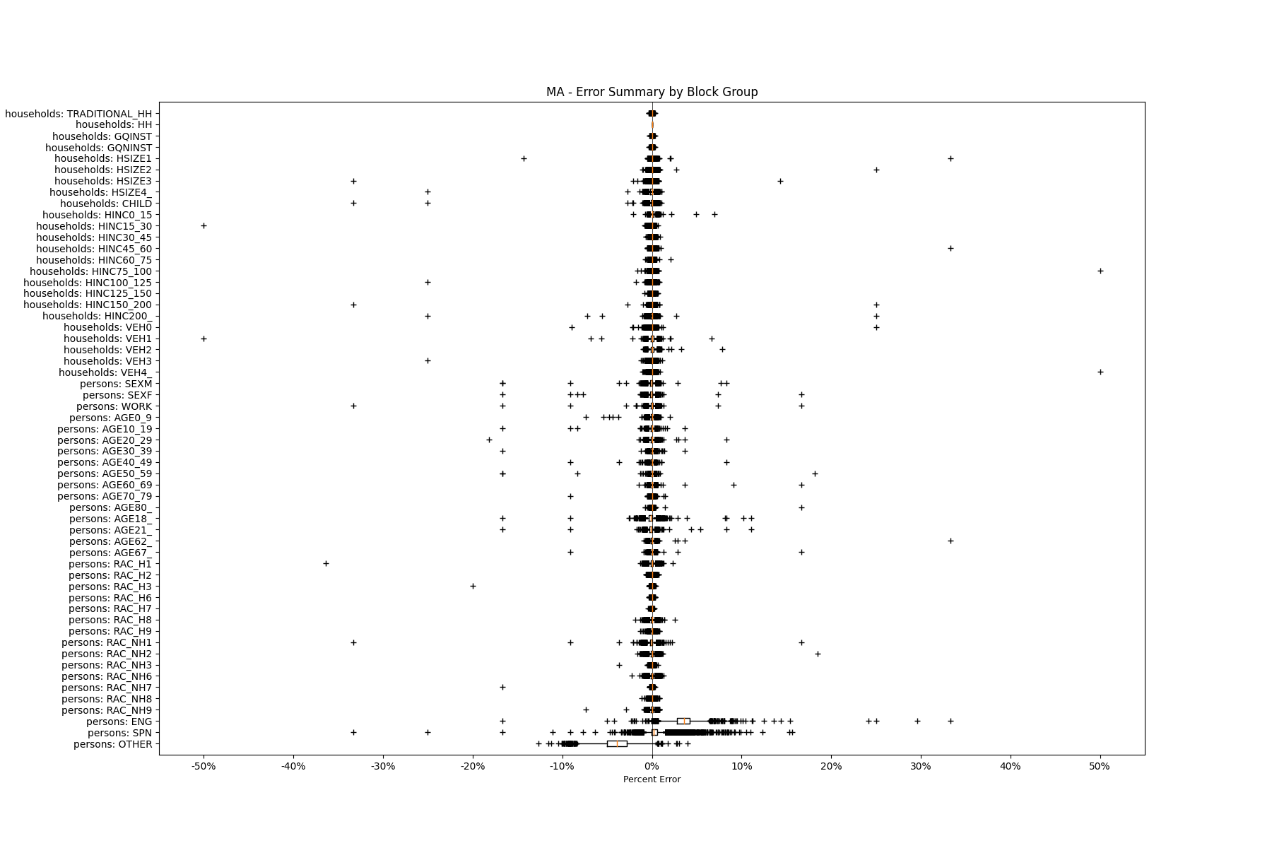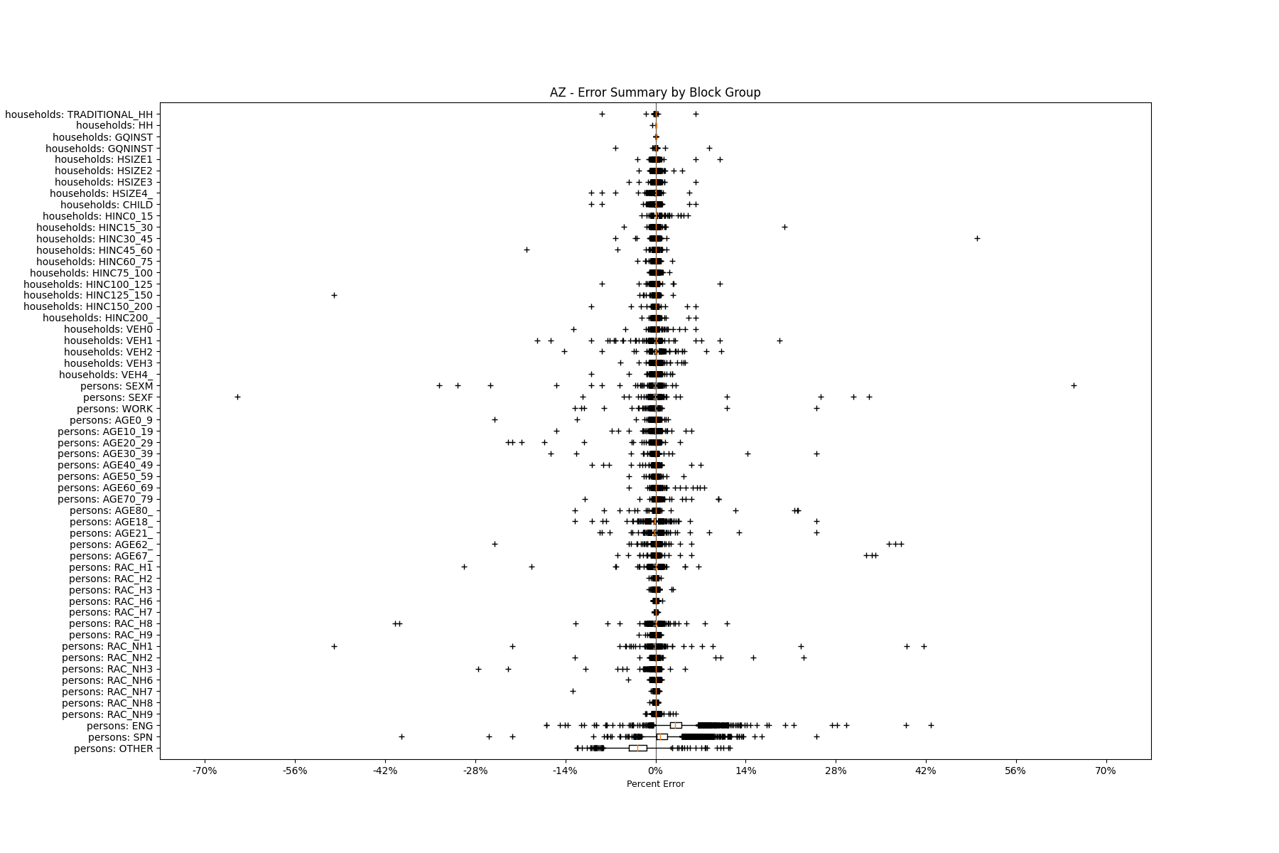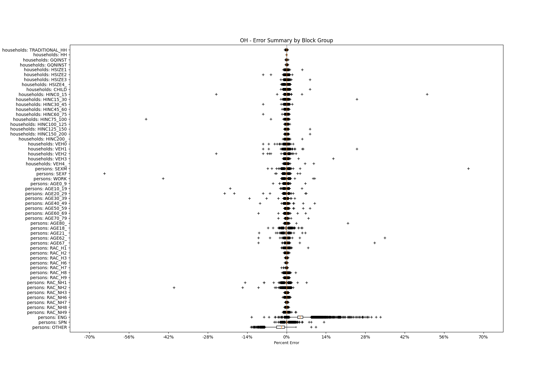 Along the horizontal axis in the plots, the distribution of the difference over the block groups between the digital total and control total is shown using a boxplot. One on this scale is a difference of one person (or household) between the control total and the digital population total. For example, block group A has a control total of 100 people and the digital population has 99 people. The ends of the horizontal lines out from the box show the 5th and 95th percentiles.