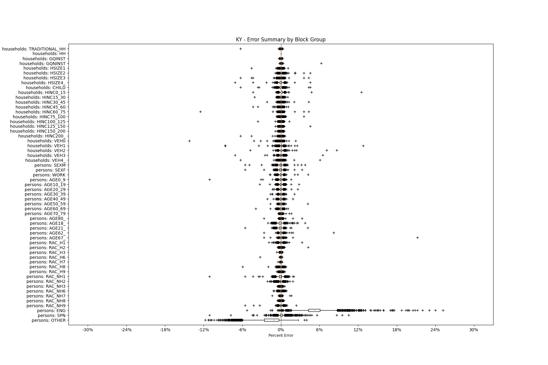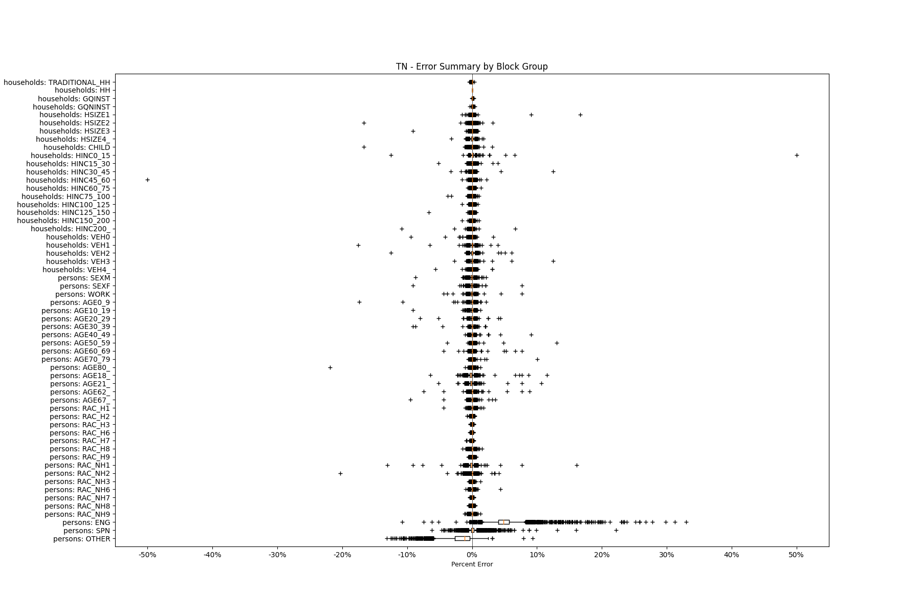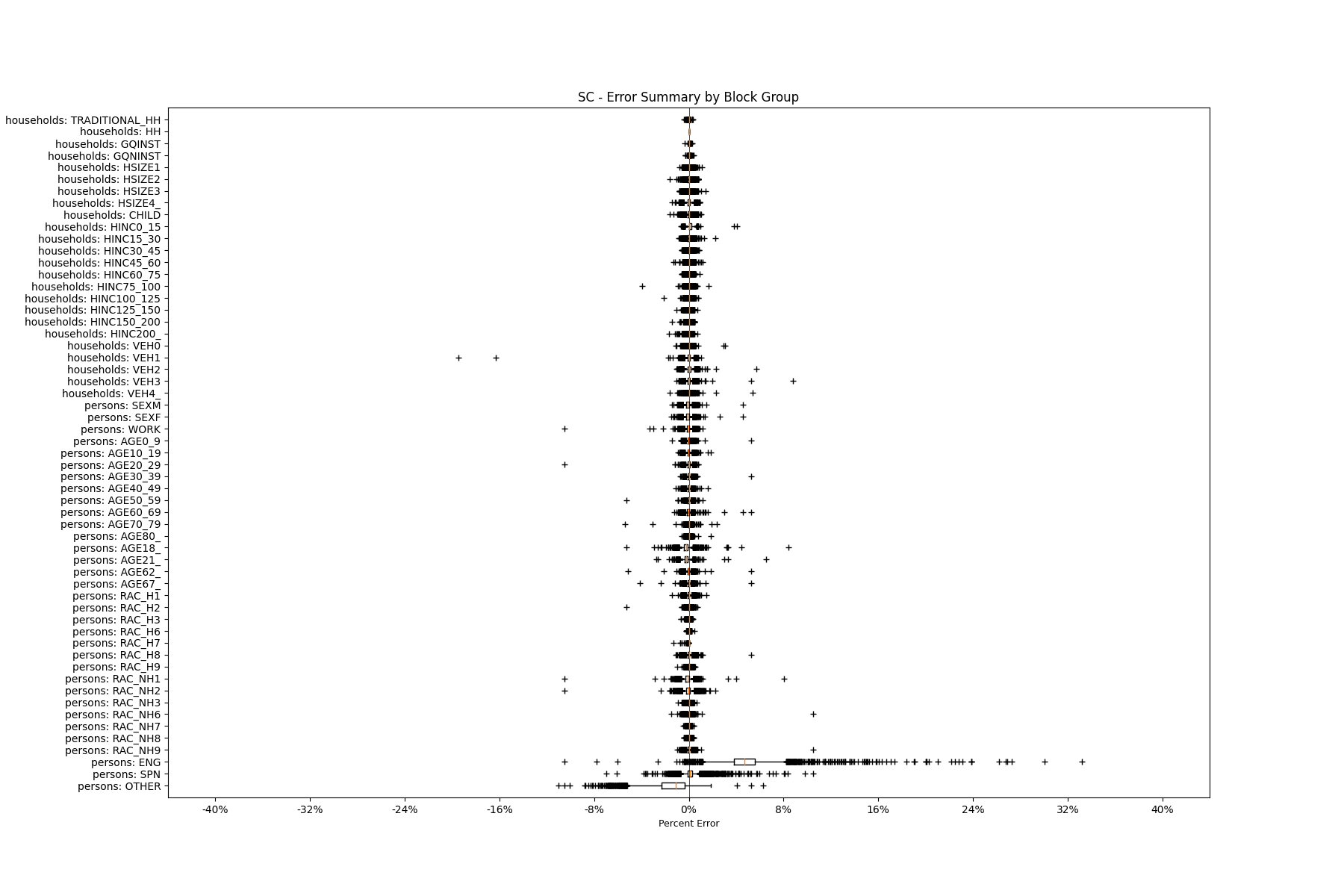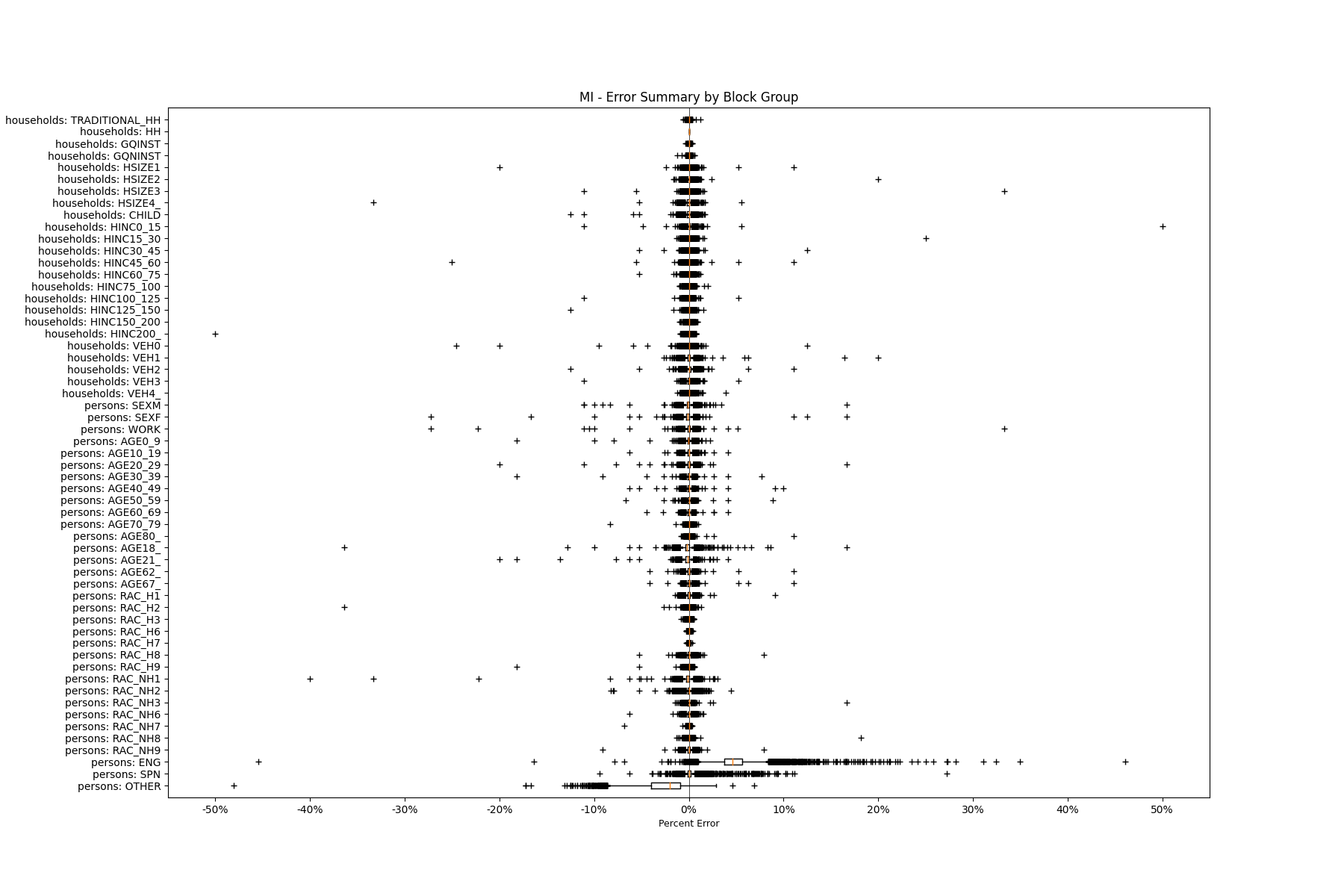 Along the horizontal axis in the plots, the distribution of the difference over the block groups between the digital total and control total is shown using a boxplot. One on this scale is a difference of one person (or household) between the control total and the digital population total. For example, block group A has a control total of 100 people and the digital population has 99 people. The ends of the horizontal lines out from the box show the 5th and 95th percentiles.