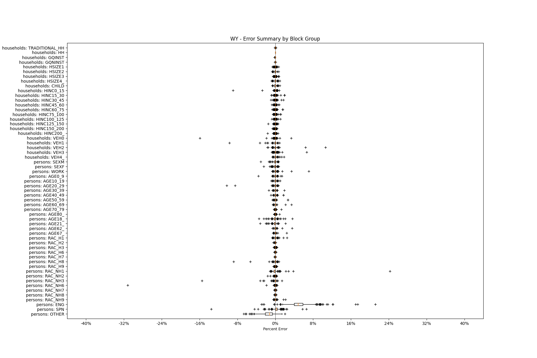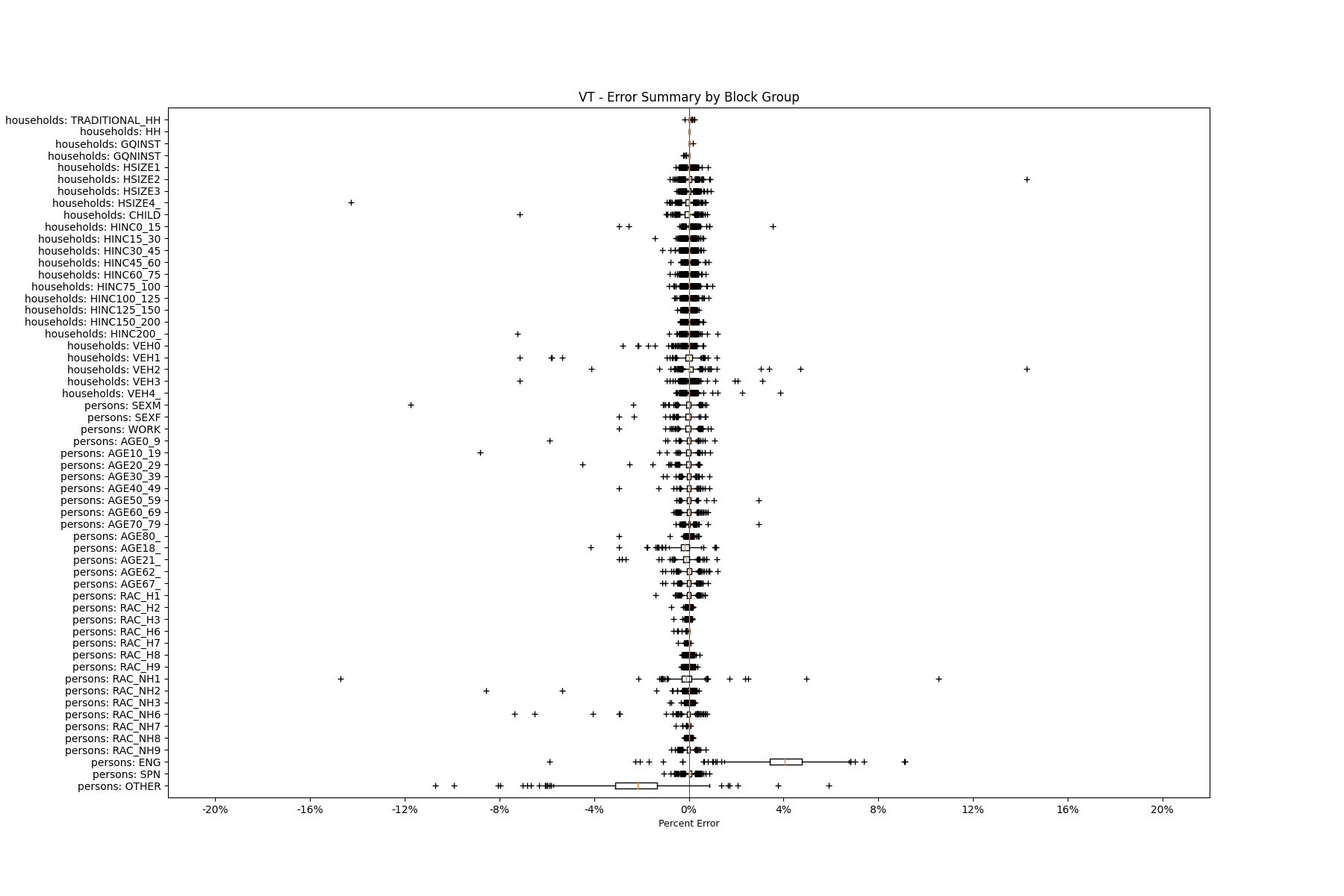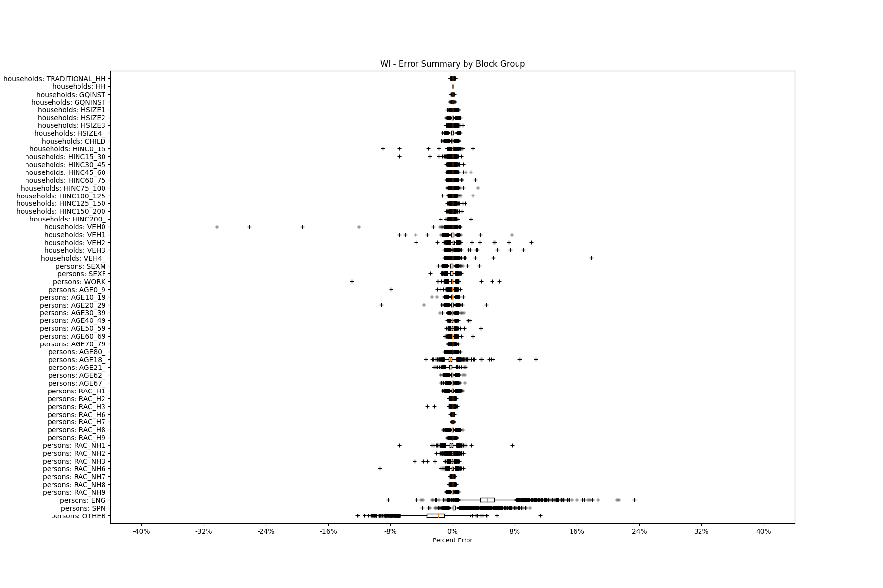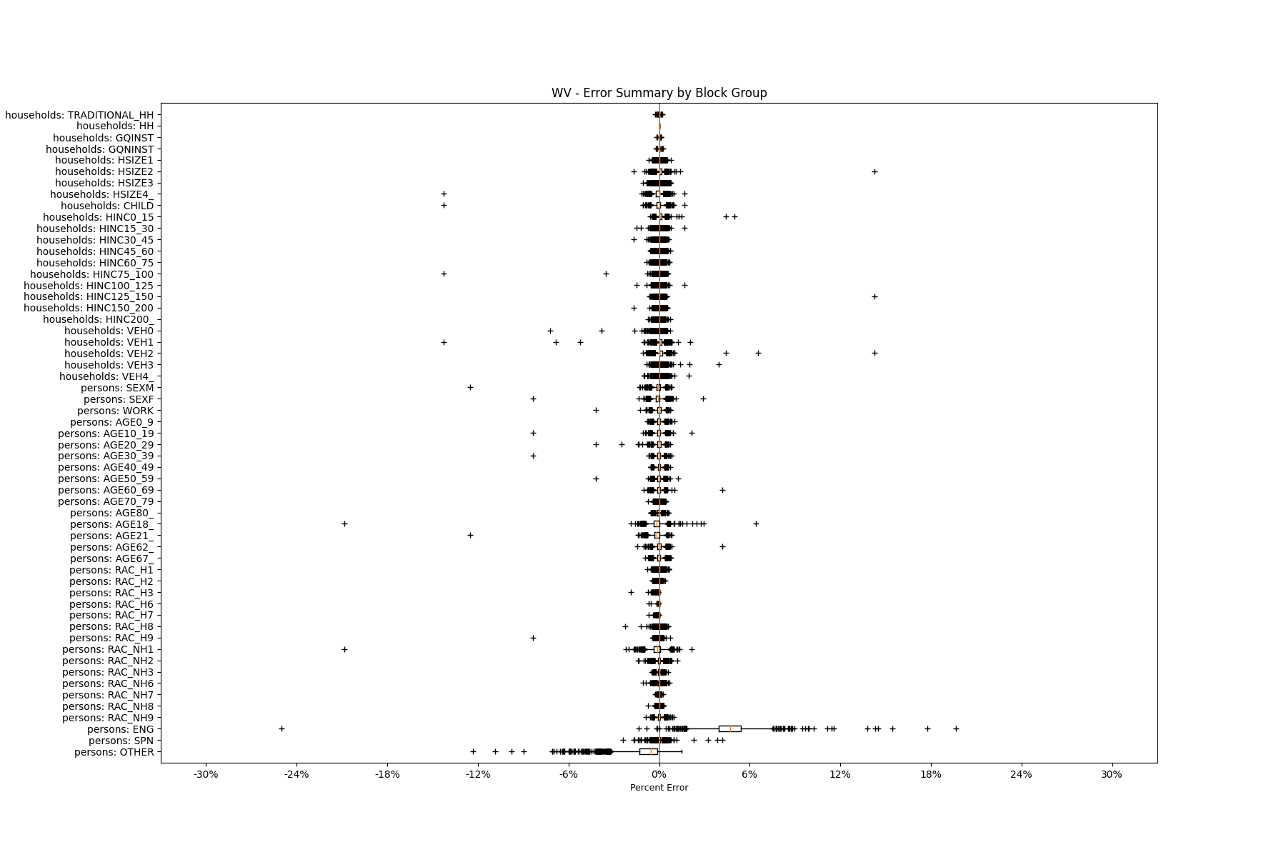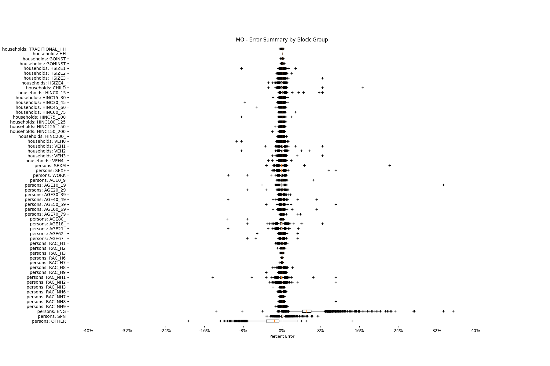 Along the horizontal axis in the plots, the distribution of the difference over the block groups between the digital total and control total is shown using a boxplot. One on this scale is a difference of one person (or household) between the control total and the digital population total. For example, block group A has a control total of 100 people and the digital population has 99 people. The ends of the horizontal lines out from the box show the 5th and 95th percentiles.