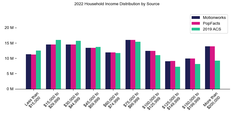 Motionworks uses Claritas household income estimates for controls for the Digital Population. The chart below represents the control category bins and the comparison in household counts for the Digital Population, Claritas, and the 2015-2019 5-Year ACS.