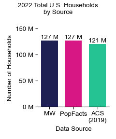 Figures in this section show high-level distributions of nationwide households and persons across various features such as age, gender, household income, etc. Comparisons are presented with the latest available US Census American Community Survey 5-Year Data from 2015-2019 and Claritas PopFacts from 2022.