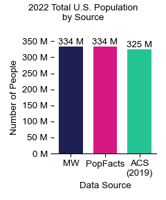 The chart below compares total population in the United States between 2015-2019 5-Year American Community Survey (ACS), 2022 Motionworks Digital Population (MW), and 2022 Claritas PopFacts. The Digital Population matches closely with 2022 PopFacts and indicates a reasonable growth of 0.9 percent annual population growth from the 2015-2019 ACS estimate.