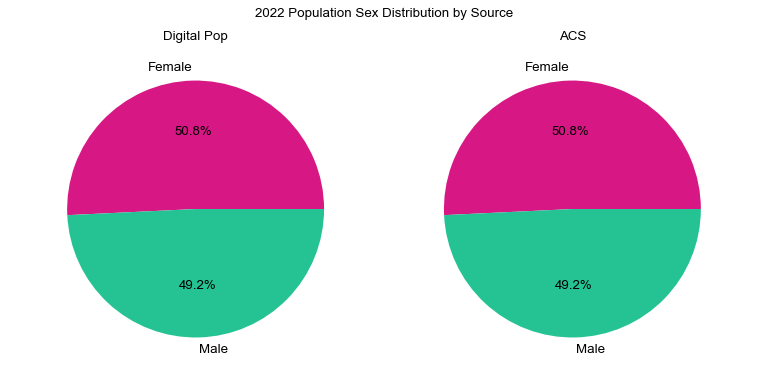 The charts below represent Motionwork's 2022 Digital Population compared to the 2015-2019 5-Year ACS for the total population by sex. The Digital Population by sex compares well to the ACS data distribution. At a national level, the Digital Population matches the sex proportions of the latest ACS data.