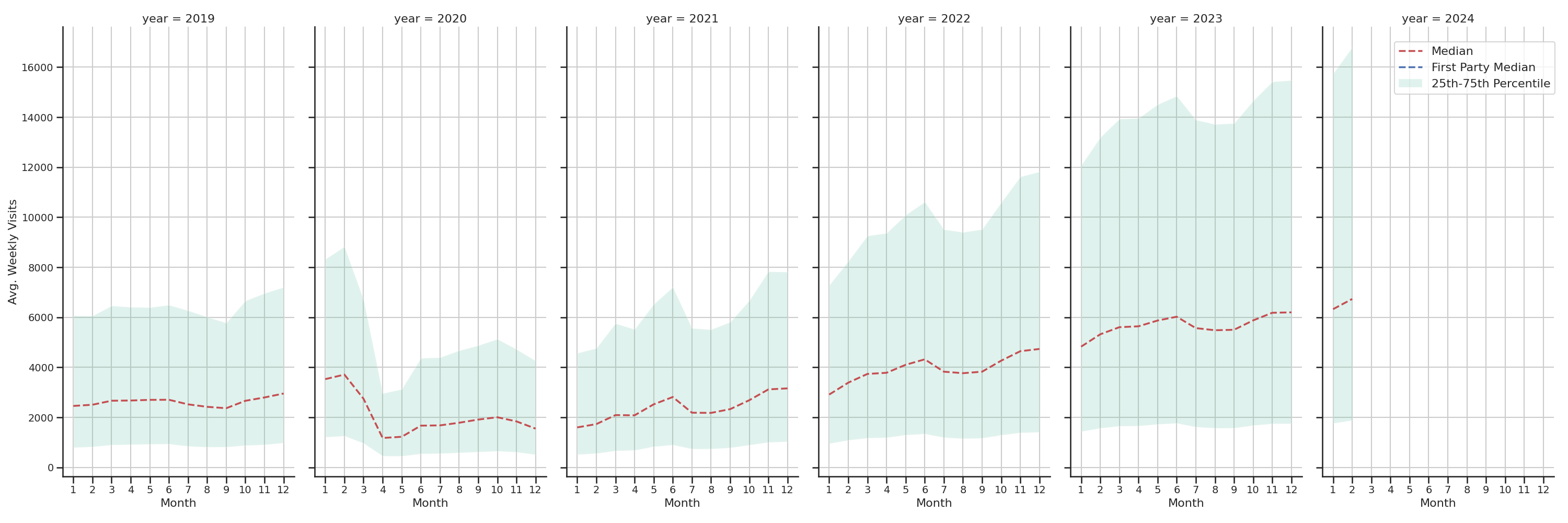 In 2024, our validation and verification metrics were expanded to include the analysis of estimated visitation metrics by place type groups to ensure reasonableness. This improvement to our validation and verification system identified unrealistic growth across some place types through 2023 and beyond. This unrealistic growth trend was a product of ongoing changes in the mobile device data marketplace that required additional modelling steps to be implemented, some of which, over time, began to include overestimation for visitation. Additional fixes for this overestimation were implemented in Placecast™ 2.1 and include applying market and place type averages for specific places that were identified as outliers. While this method continues to be used, Motionworks acknowledges that the approach impacted certain specific places where the visitation that was identified as an outlier would have been more in line with expectations for those specific places. This can be seen in the place type reports linked above, and for the example of theaters below.