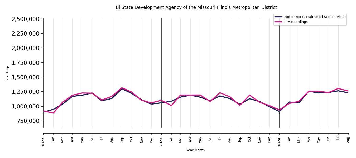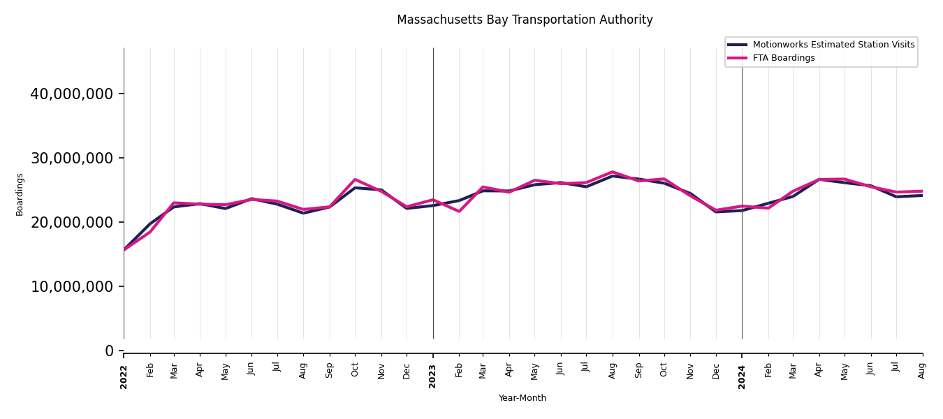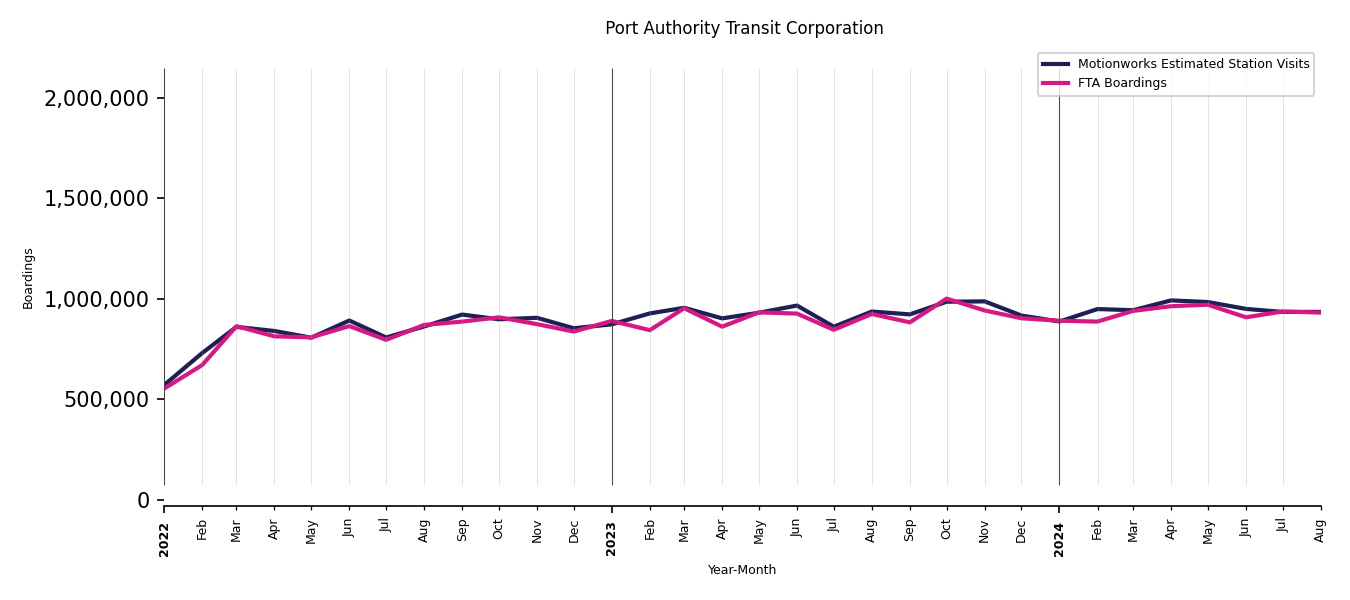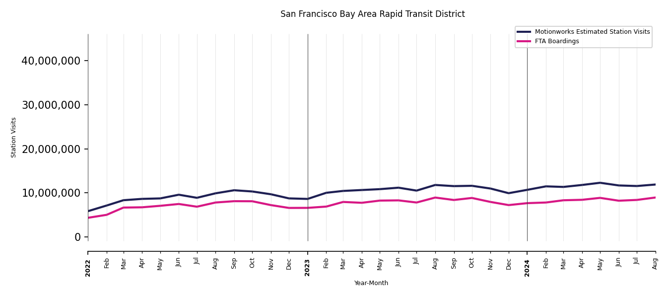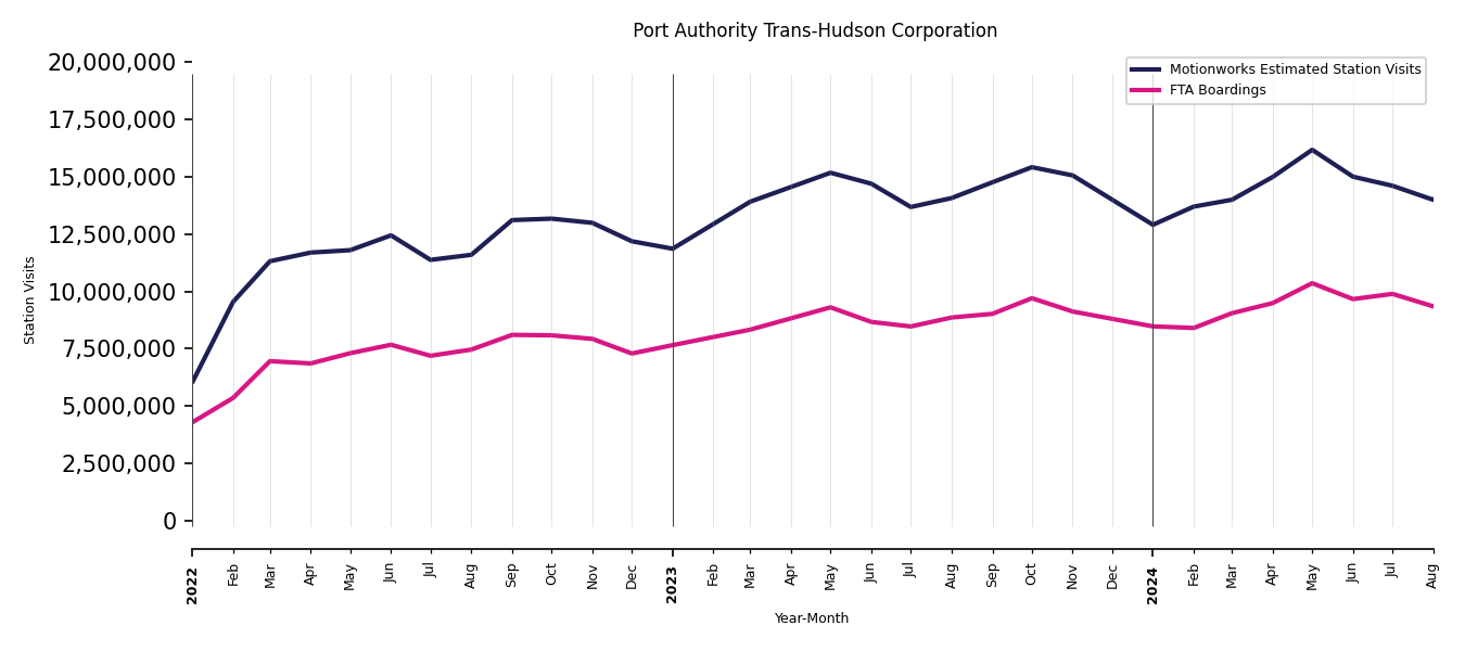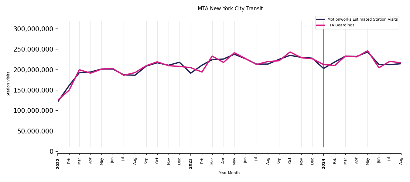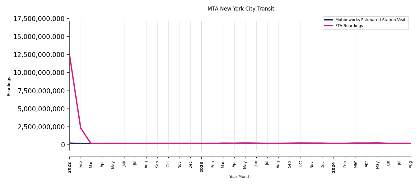 As mentioned above, in this case, Motionworks relies on first party data from the FTA NTD, which provides total monthly boardings by system and mode. We estimate the total number of entrances and exits (i.e., visits) to the stations of a system that we have in our places database by the following formula (SystemVisits = SystemBoardings x 2 x CoverageRatio), In this formula, CoverageRatio is the percentage of the stations that we cover in our database. Since Motionworks has onboarded all available stations for systems that are measured, the coverage ratio is 100%.