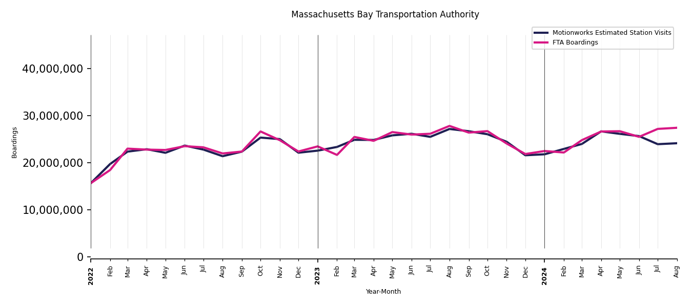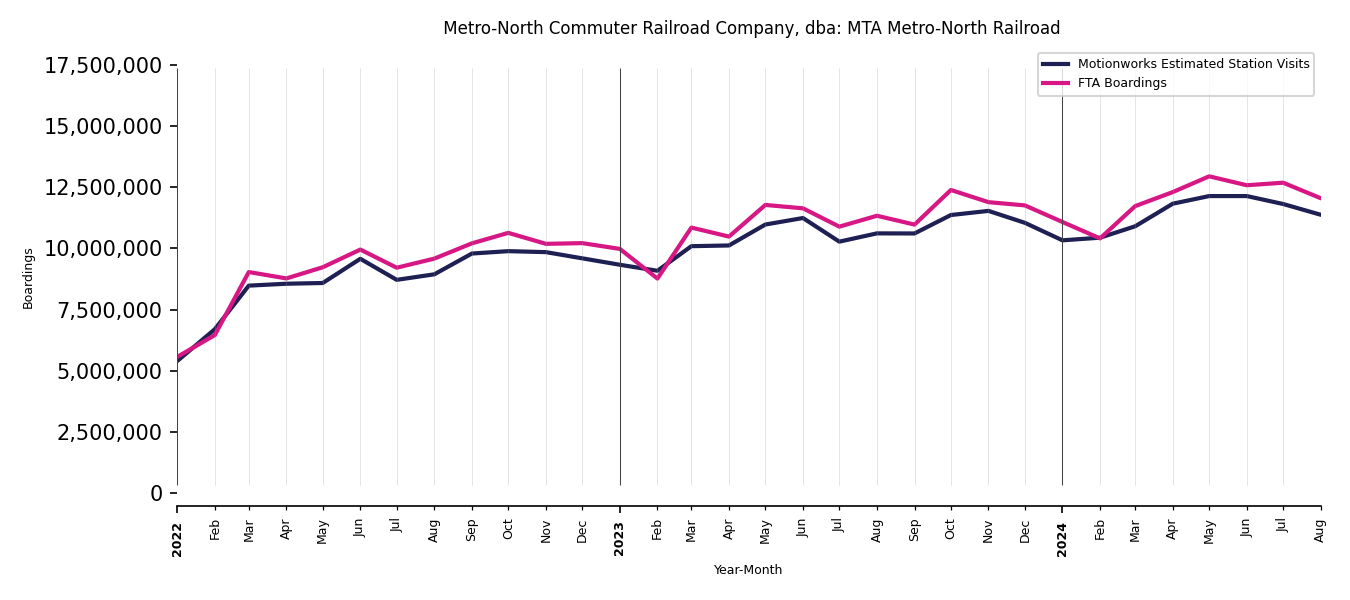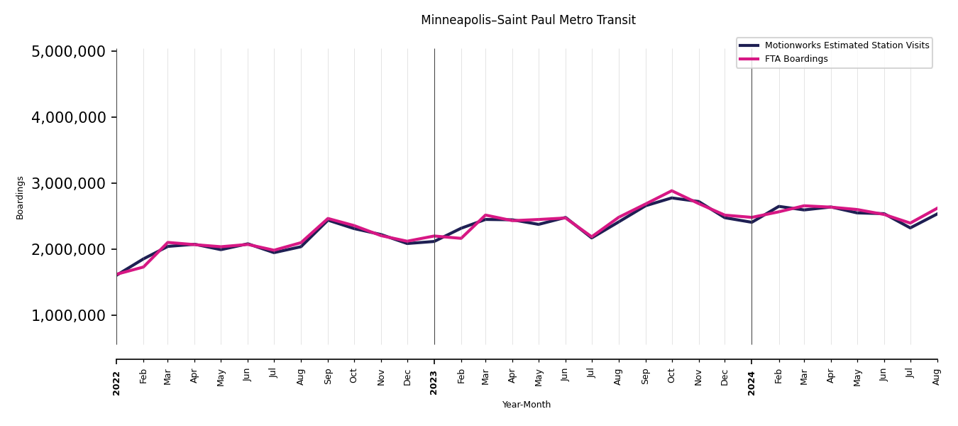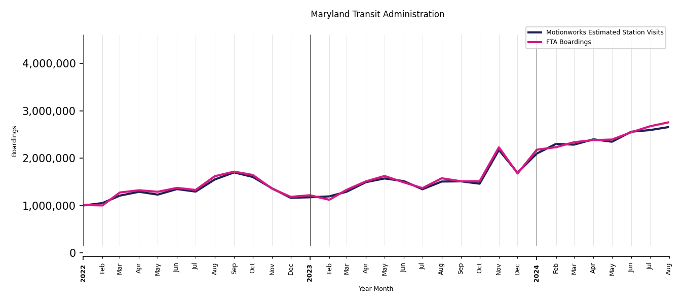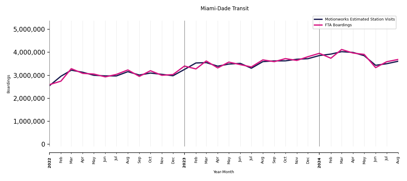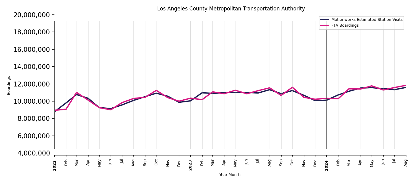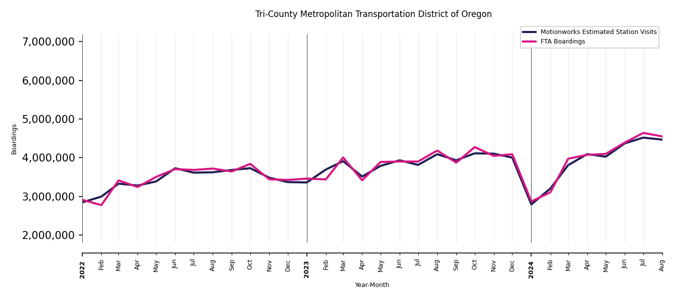 As mentioned above, in this case, Motionworks relies on first party data from the FTA NTD, which provides total monthly boardings by system and mode. We estimate the total number of entrances and exits (i.e., visits) to the stations of a system that we have in our places database by the following formula (SystemVisits = SystemBoardings x 2 x CoverageRatio), In this formula, CoverageRatio is the percentage of the stations that we cover in our database. Since Motionworks has onboarded all available stations for systems that are measured, the coverage ratio is 100%.