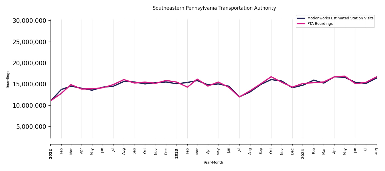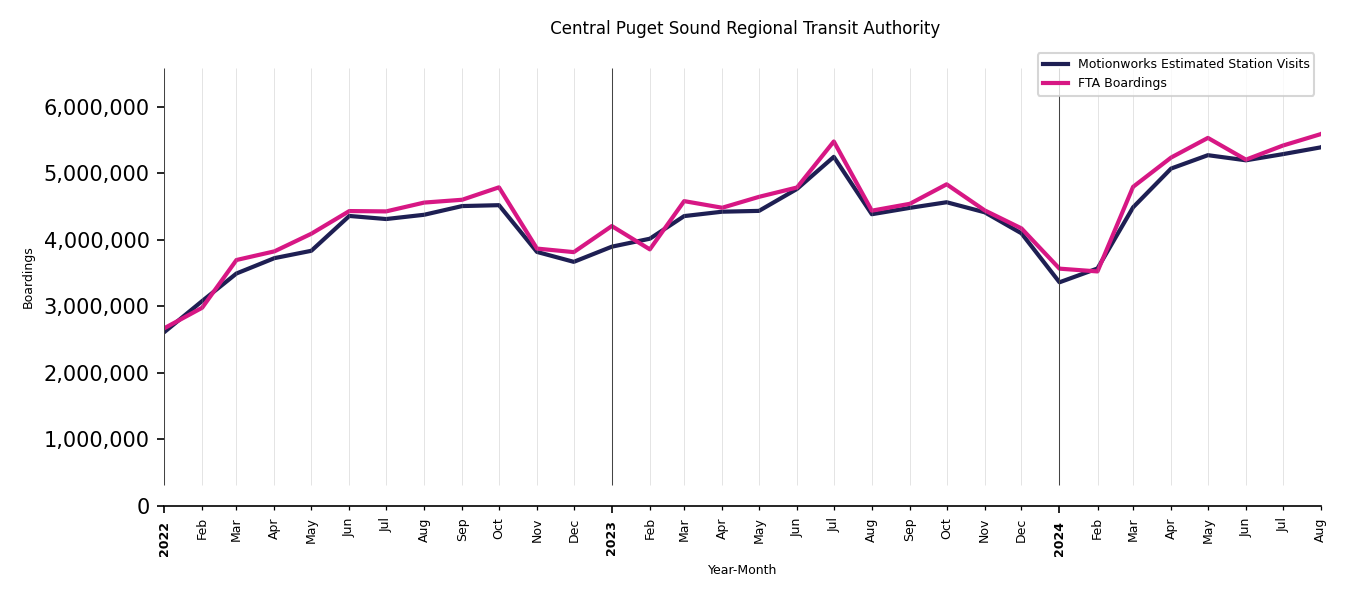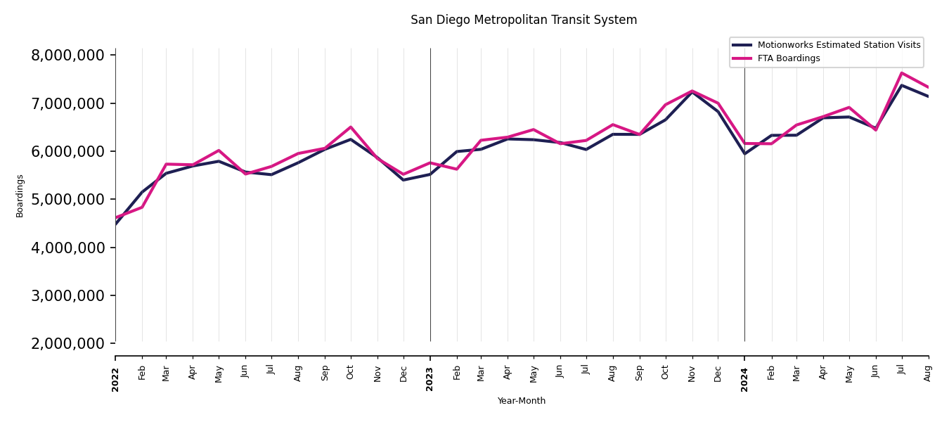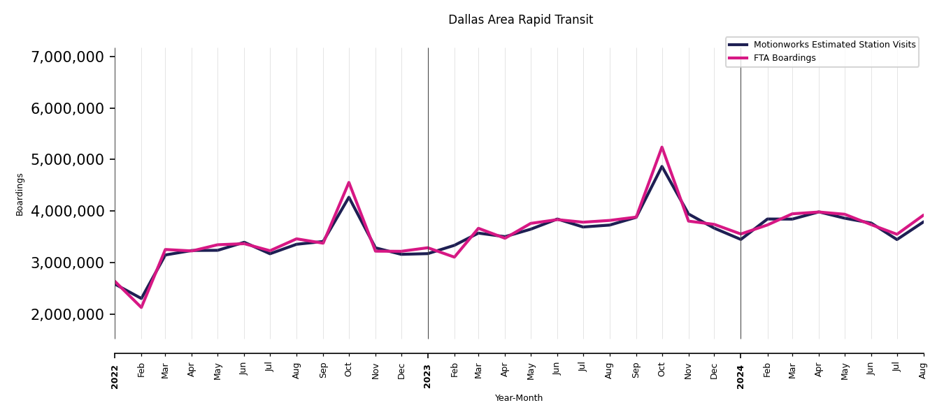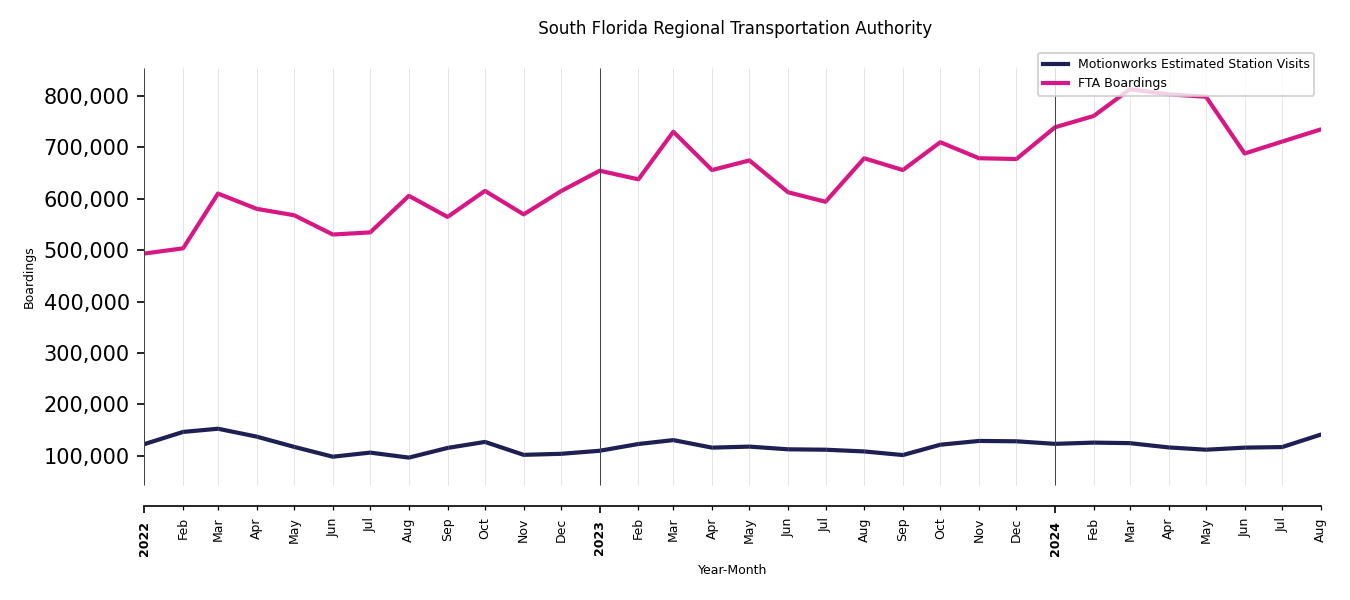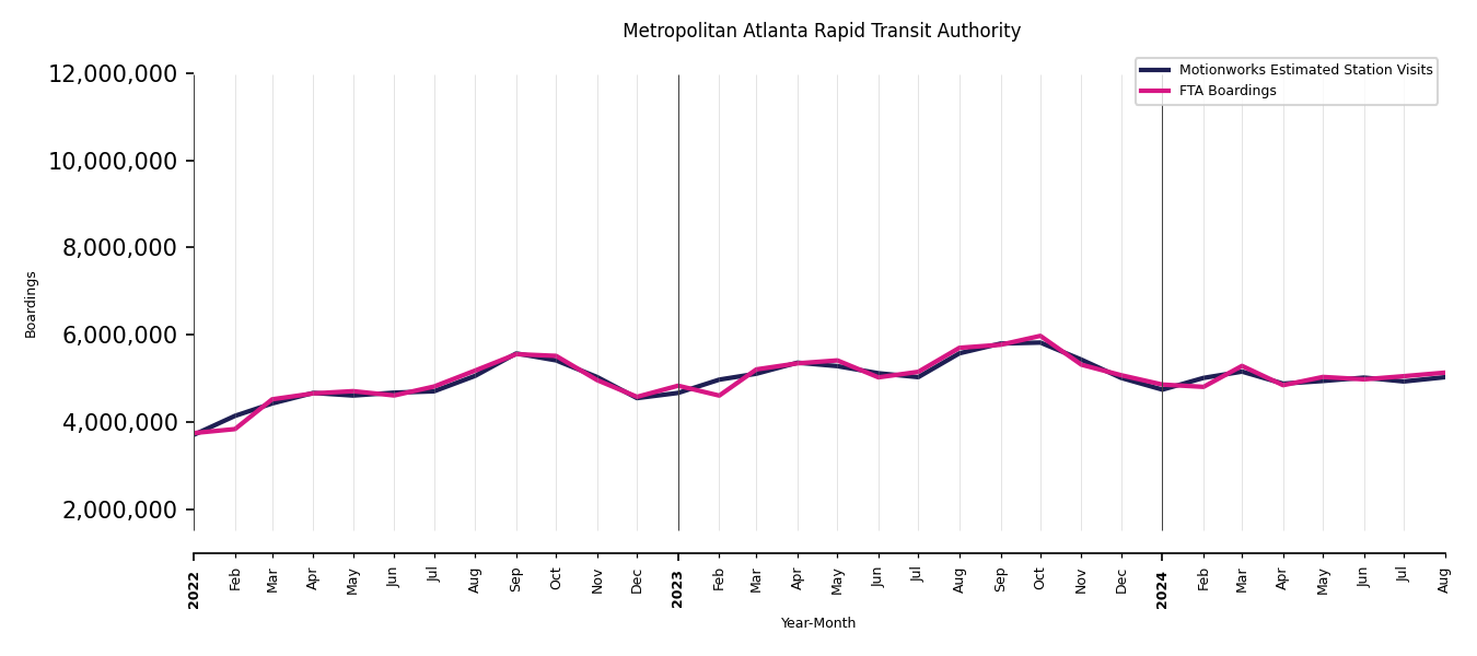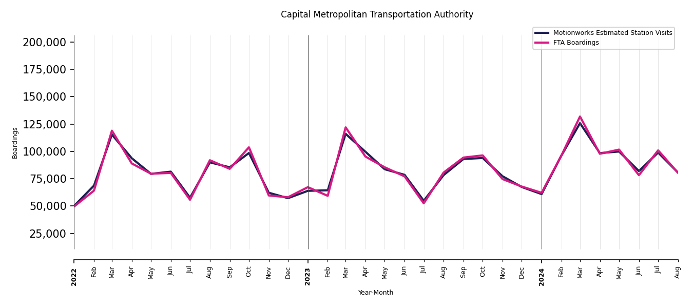 As mentioned above, in this case, Motionworks relies on first party data from the FTA NTD, which provides total monthly boardings by system and mode. We estimate the total number of entrances and exits (i.e., visits) to the stations of a system that we have in our places database by the following formula (SystemVisits = SystemBoardings x 2 x CoverageRatio), In this formula, CoverageRatio is the percentage of the stations that we cover in our database. Since Motionworks has onboarded all available stations for systems that are measured, the coverage ratio is 100%.