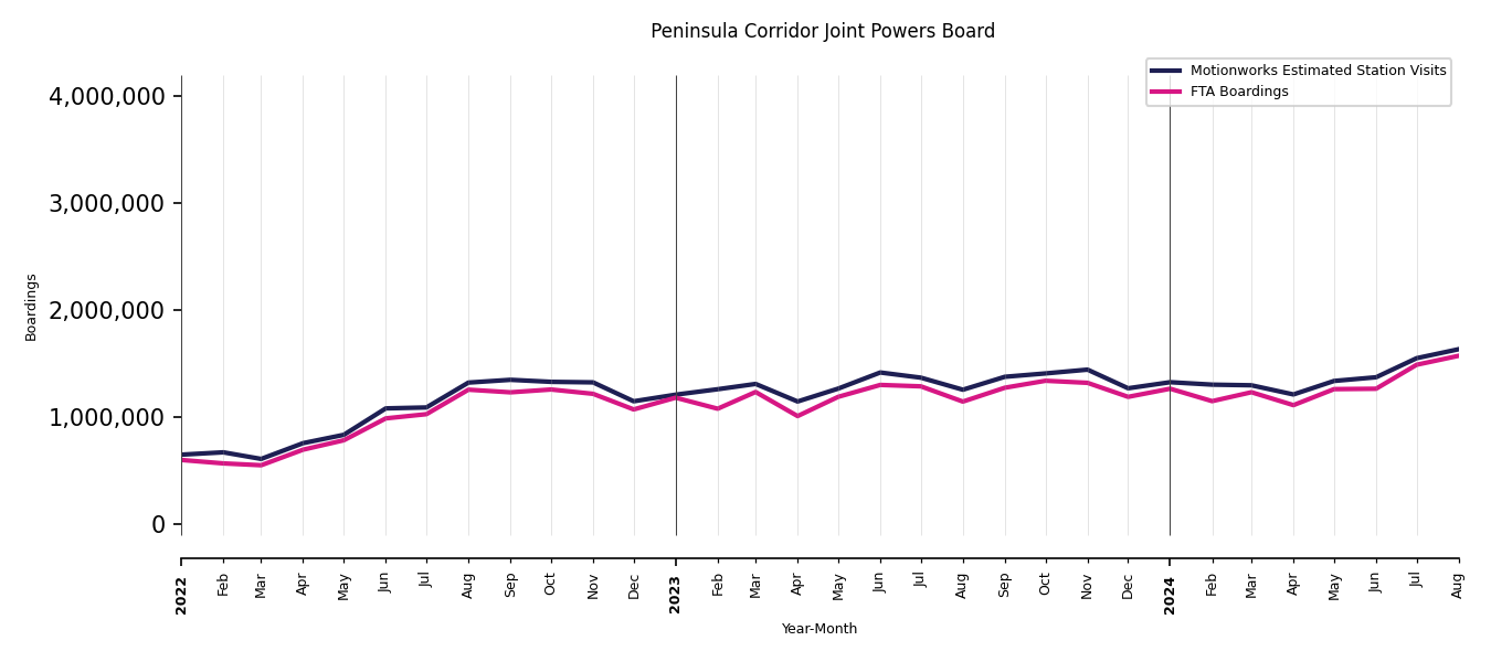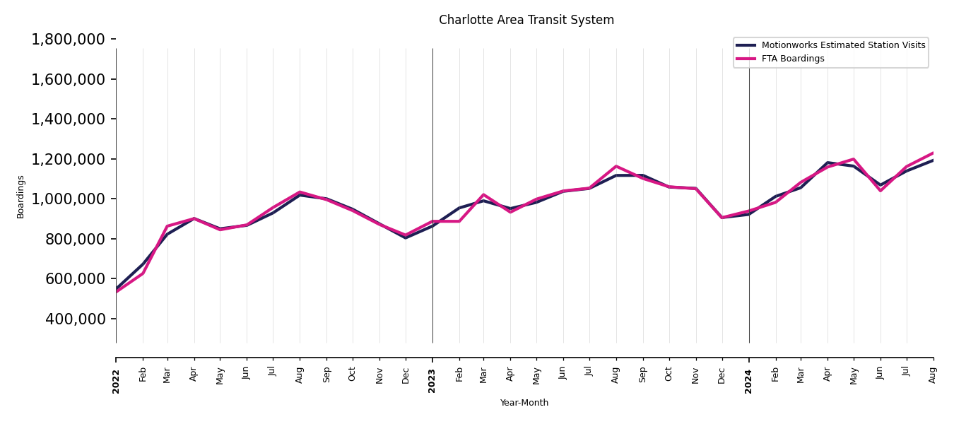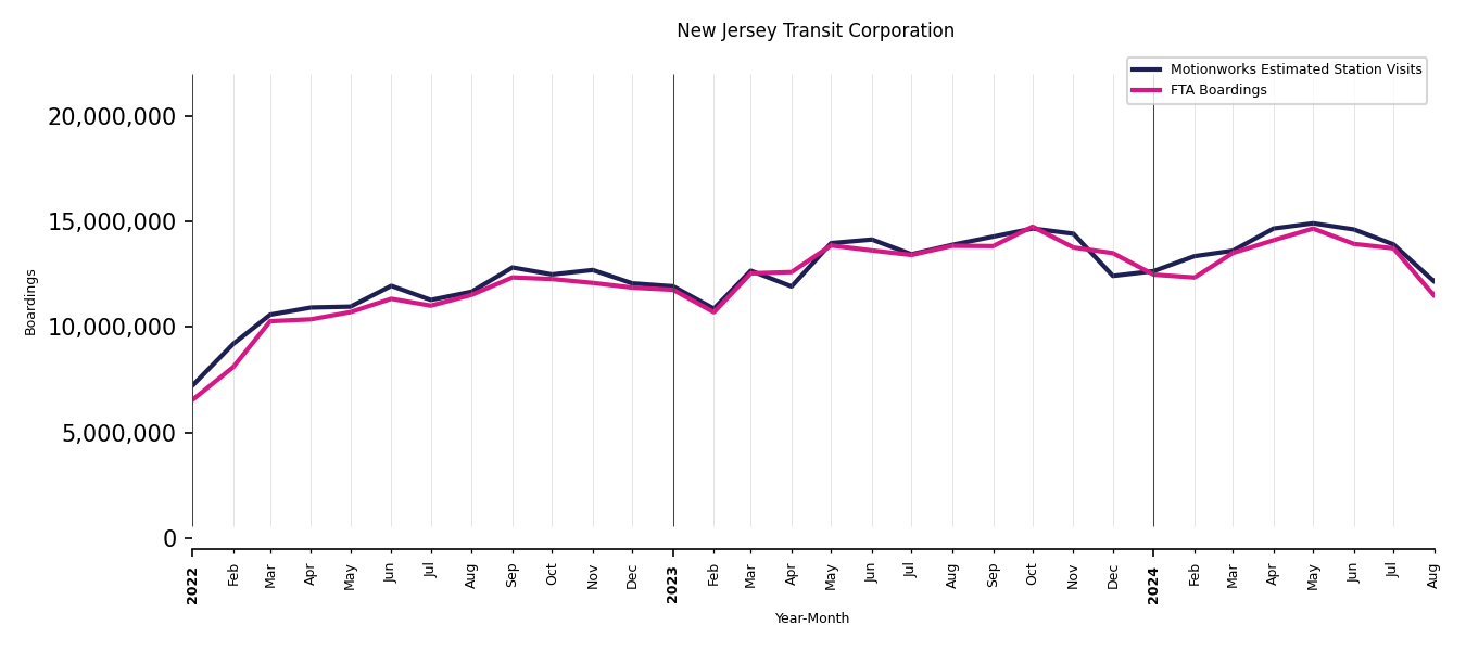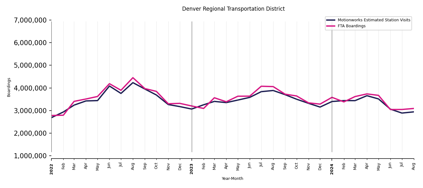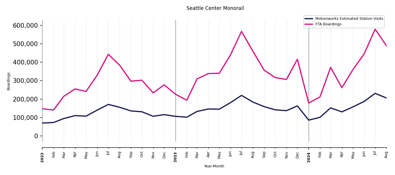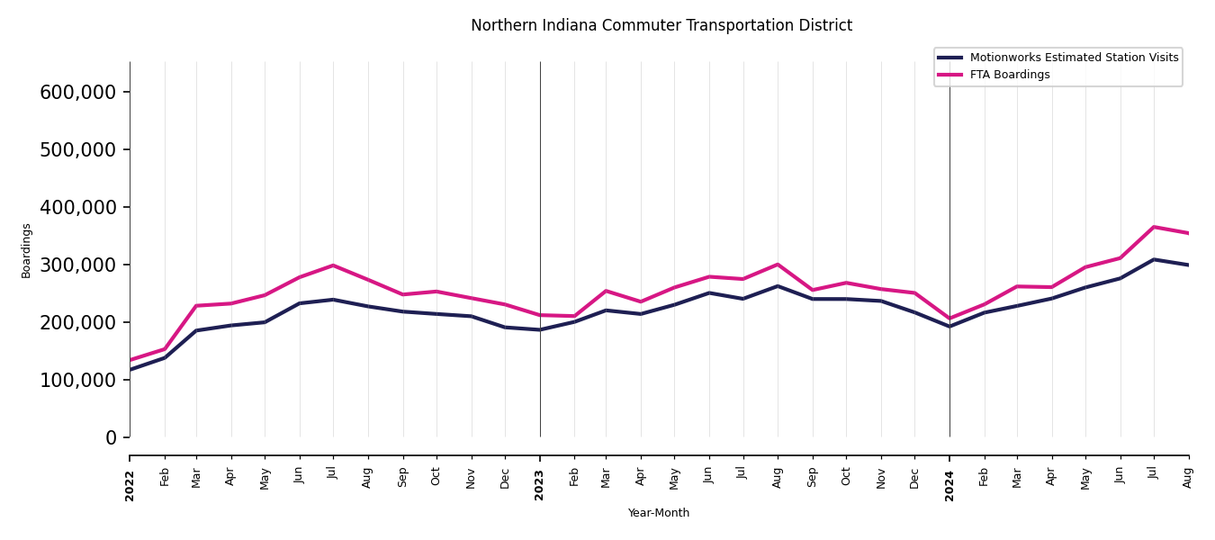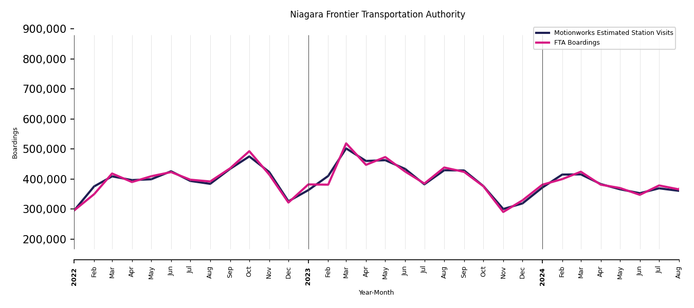 As mentioned above, in this case, Motionworks relies on first party data from the FTA NTD, which provides total monthly boardings by system and mode. We estimate the total number of entrances and exits (i.e., visits) to the stations of a system that we have in our places database by the following formula (SystemVisits = SystemBoardings x 2 x CoverageRatio), In this formula, CoverageRatio is the percentage of the stations that we cover in our database. Since Motionworks has onboarded all available stations for systems that are measured, the coverage ratio is 100%.
