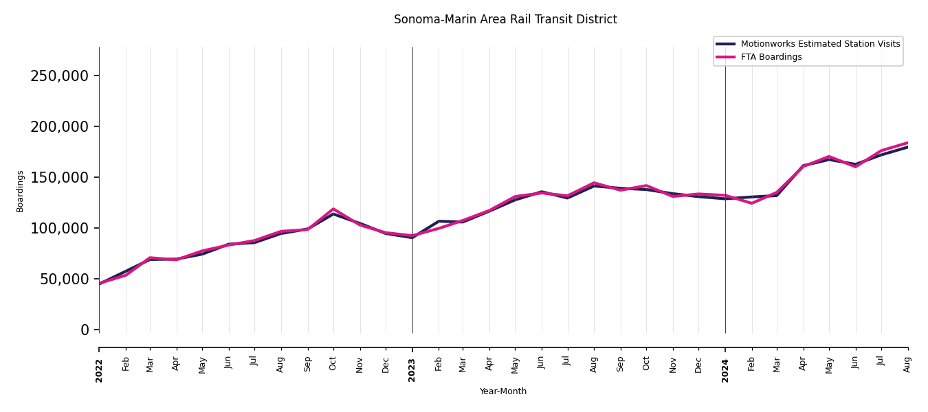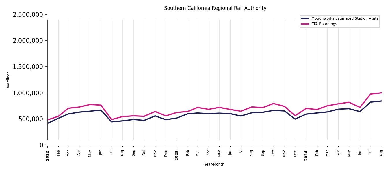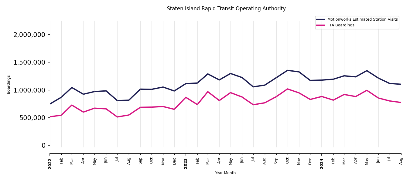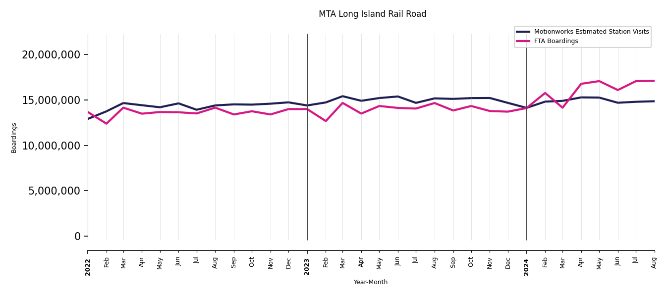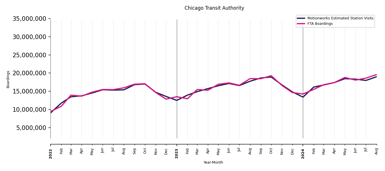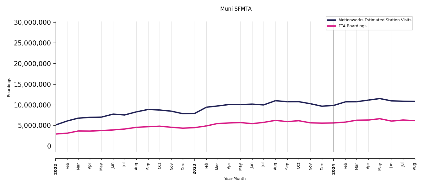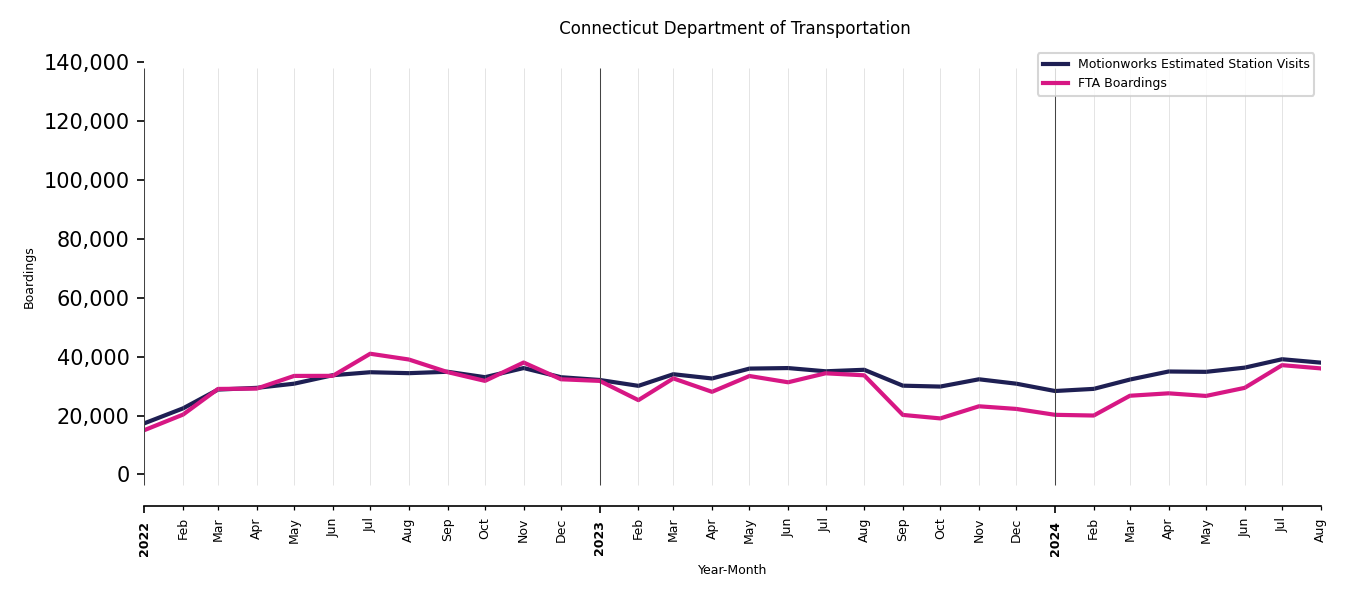 As mentioned above, in this case, Motionworks relies on first party data from the FTA NTD, which provides total monthly boardings by system and mode. We estimate the total number of entrances and exits (i.e., visits) to the stations of a system that we have in our places database by the following formula (SystemVisits = SystemBoardings x 2 x CoverageRatio), In this formula, CoverageRatio is the percentage of the stations that we cover in our database. Since Motionworks has onboarded all available stations for systems that are measured, the coverage ratio is 100%.