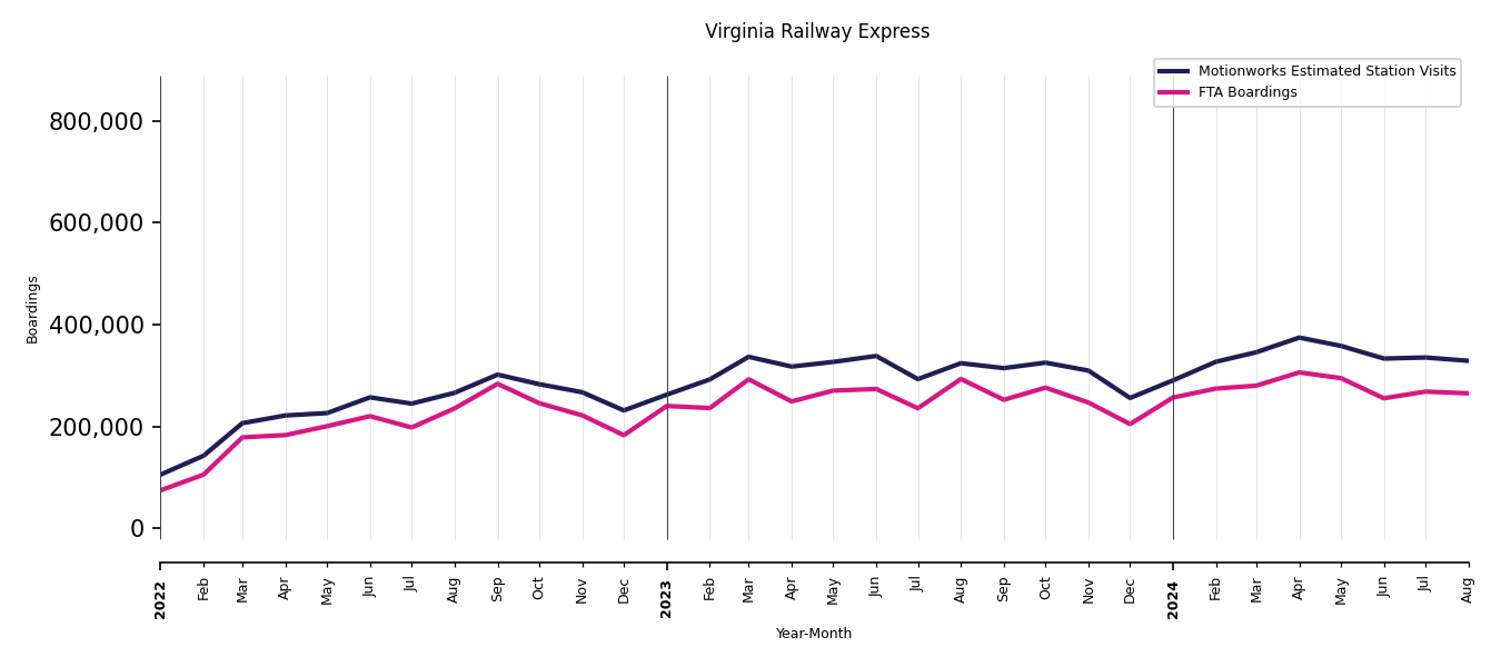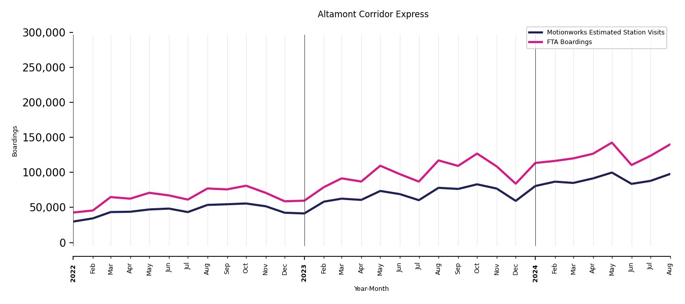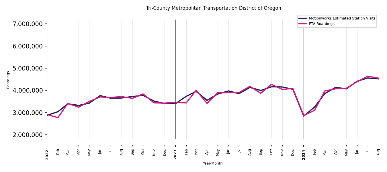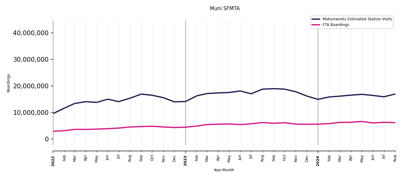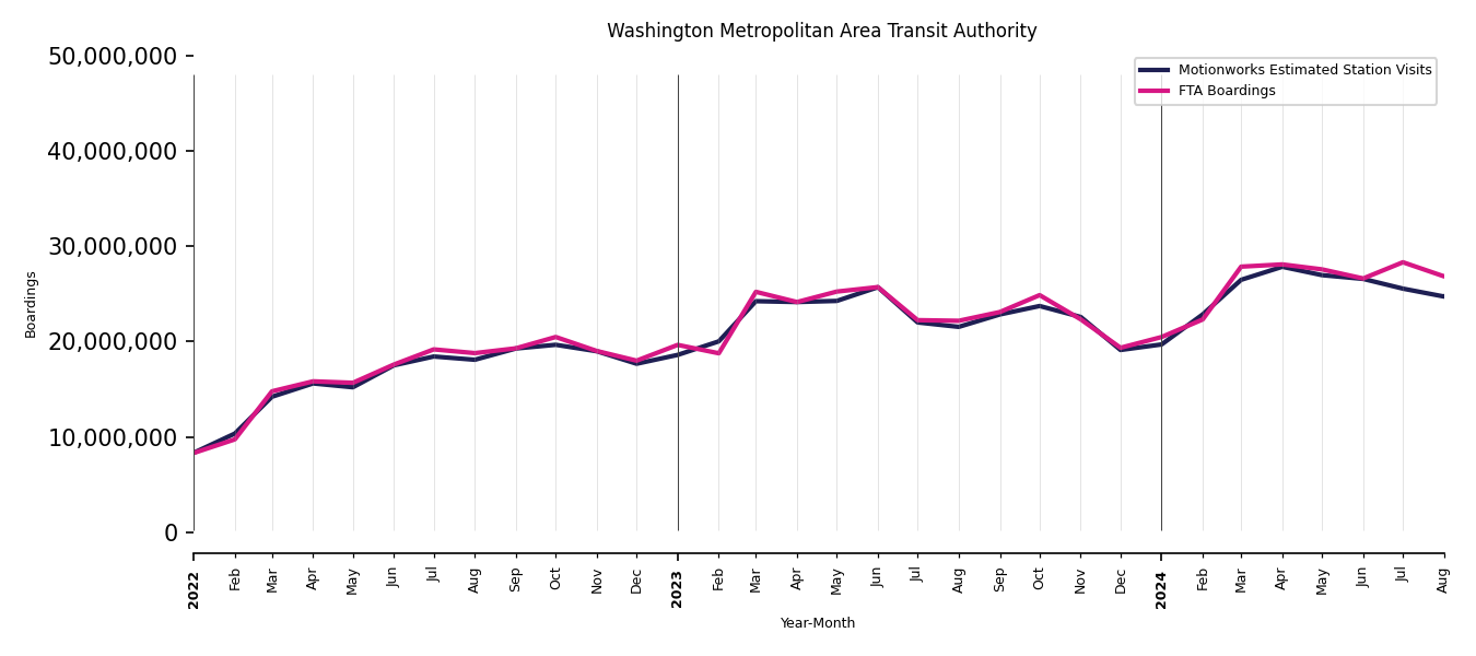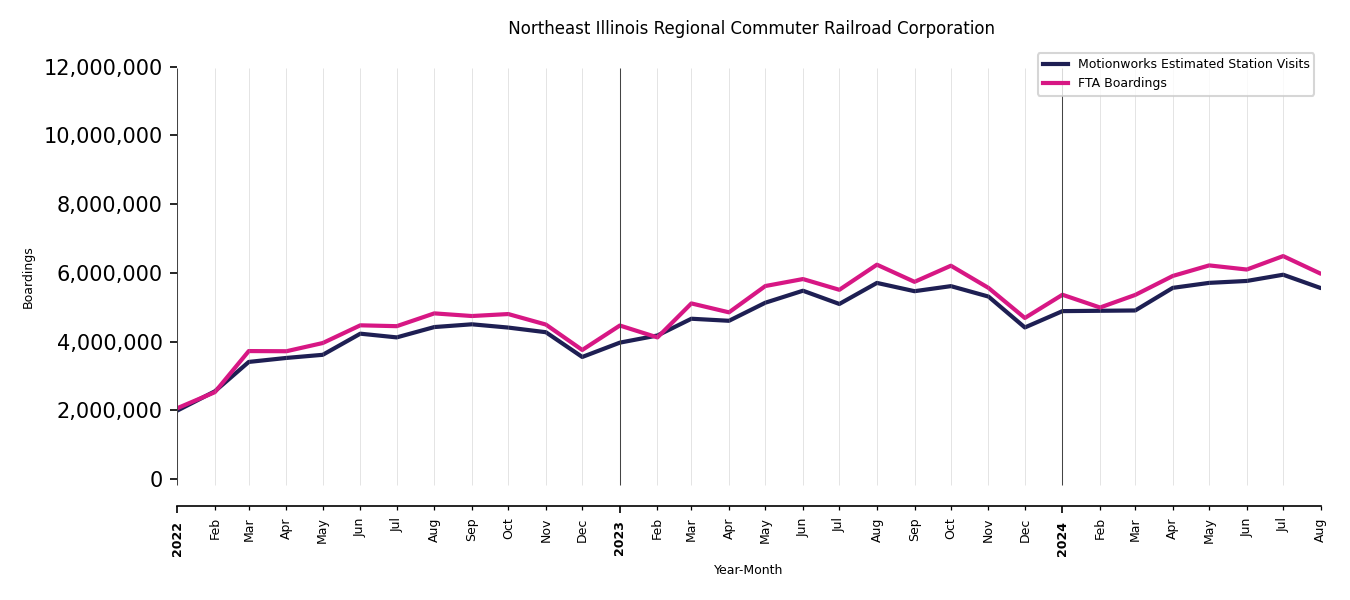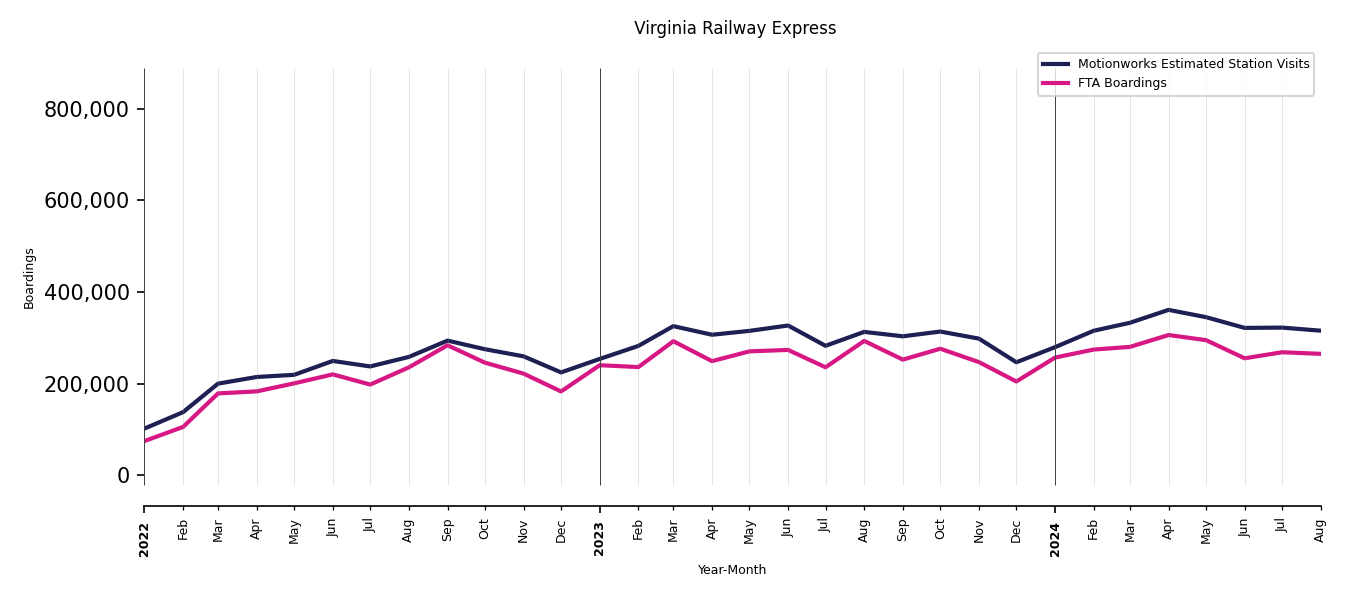 As mentioned above, in this case, Motionworks relies on first party data from the FTA NTD, which provides total monthly boardings by system and mode. We estimate the total number of entrances and exits (i.e., visits) to the stations of a system that we have in our places database by the following formula (SystemVisits = SystemBoardings x 2 x CoverageRatio), In this formula, CoverageRatio is the percentage of the stations that we cover in our database. Since Motionworks has onboarded all available stations for systems that are measured, the coverage ratio is 100%.