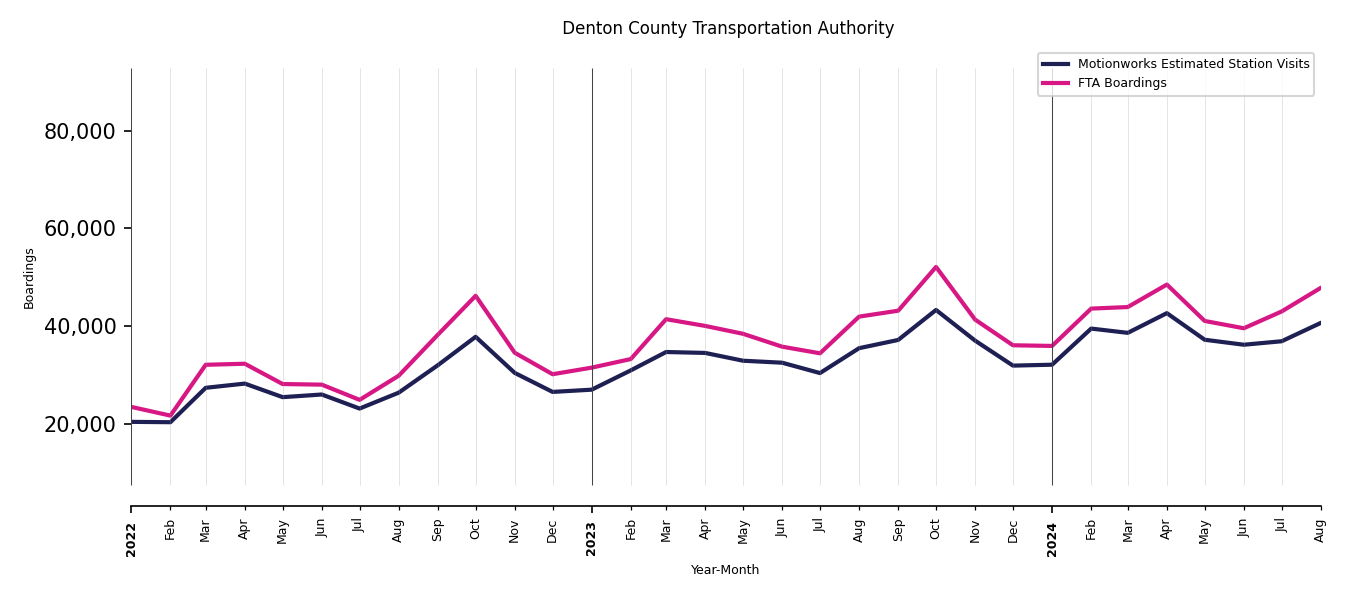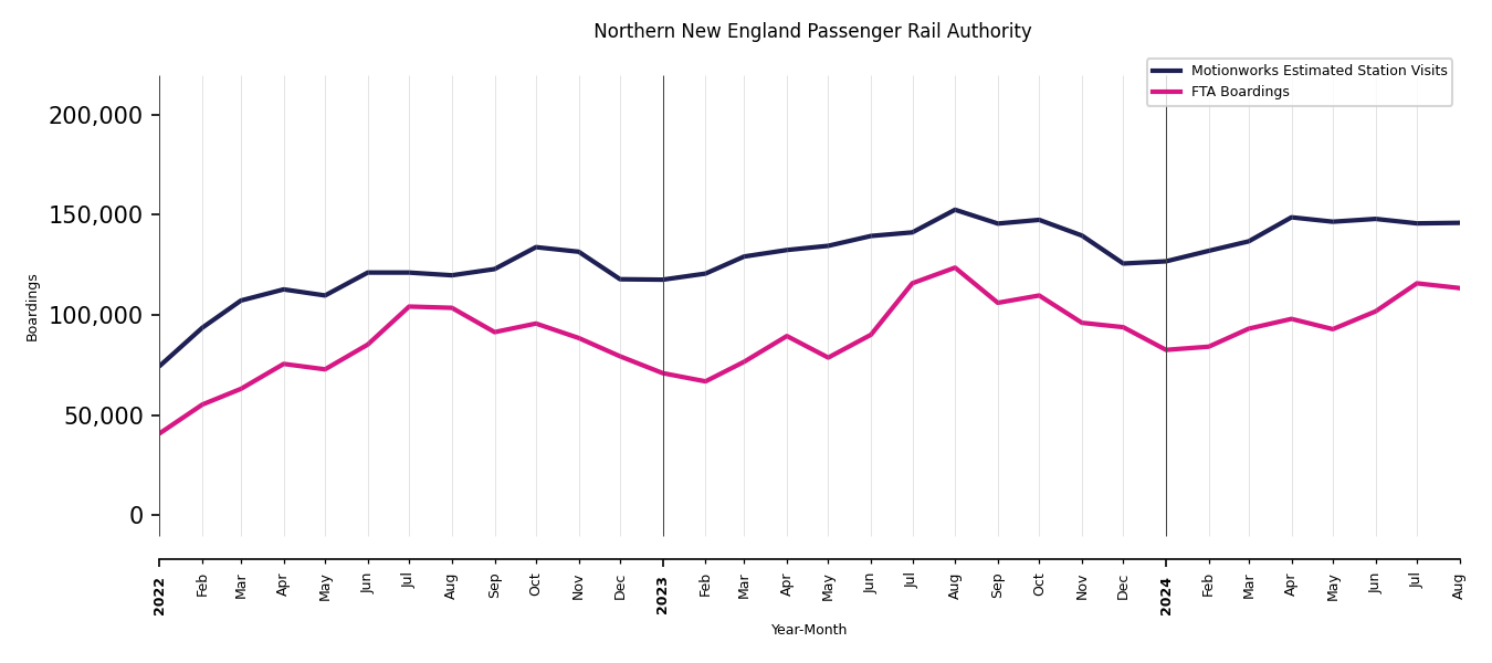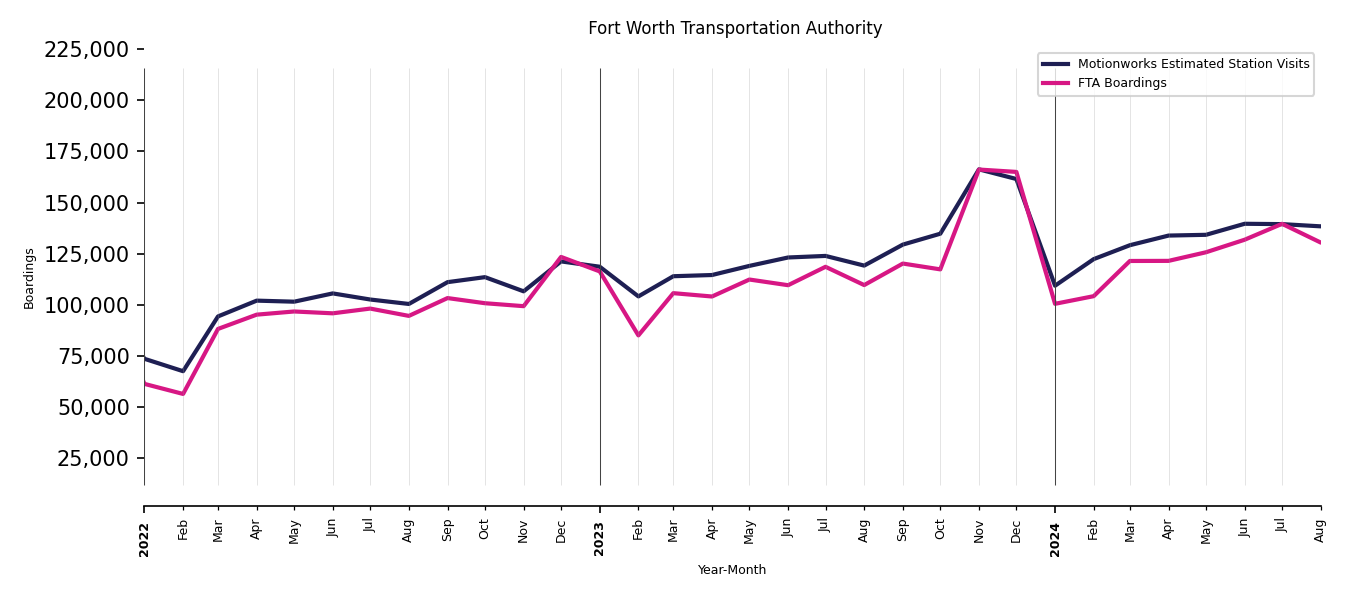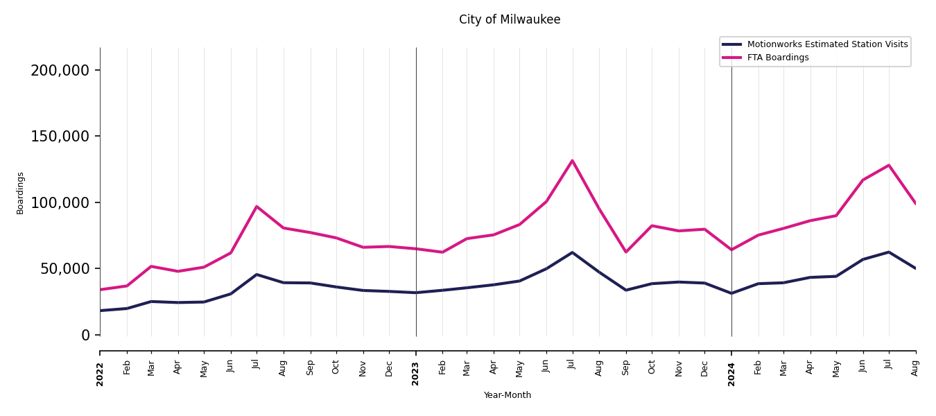 Once the base visitation of the transit stations is understood and the transit stations are mapped appropriately, Motionworks then calculates a value to use for scaling the base visitation of any transit station for which first party data is available. Motionworks uses the FTA NTD monthly data for systems where ridership data is not available on a monthly basis. For all other systems where first party data is available on a monthly (or more often) basis, Motionworks uses that data.