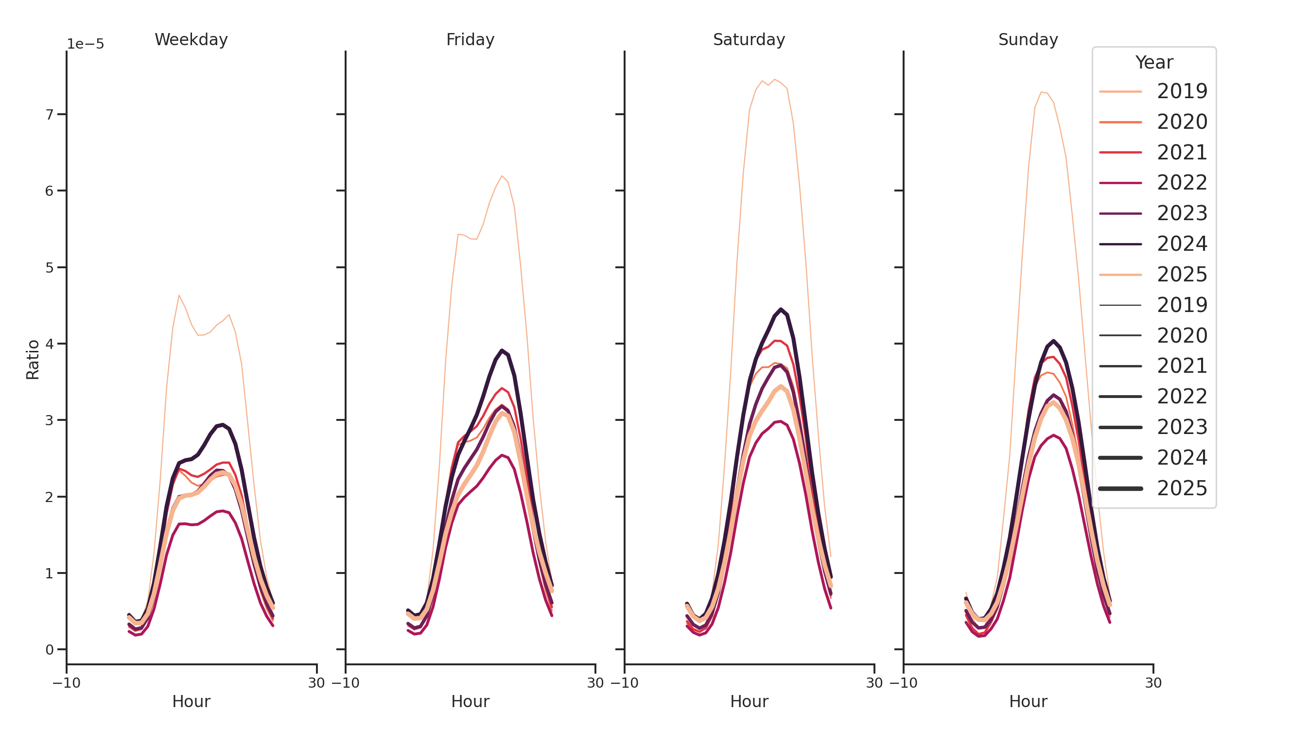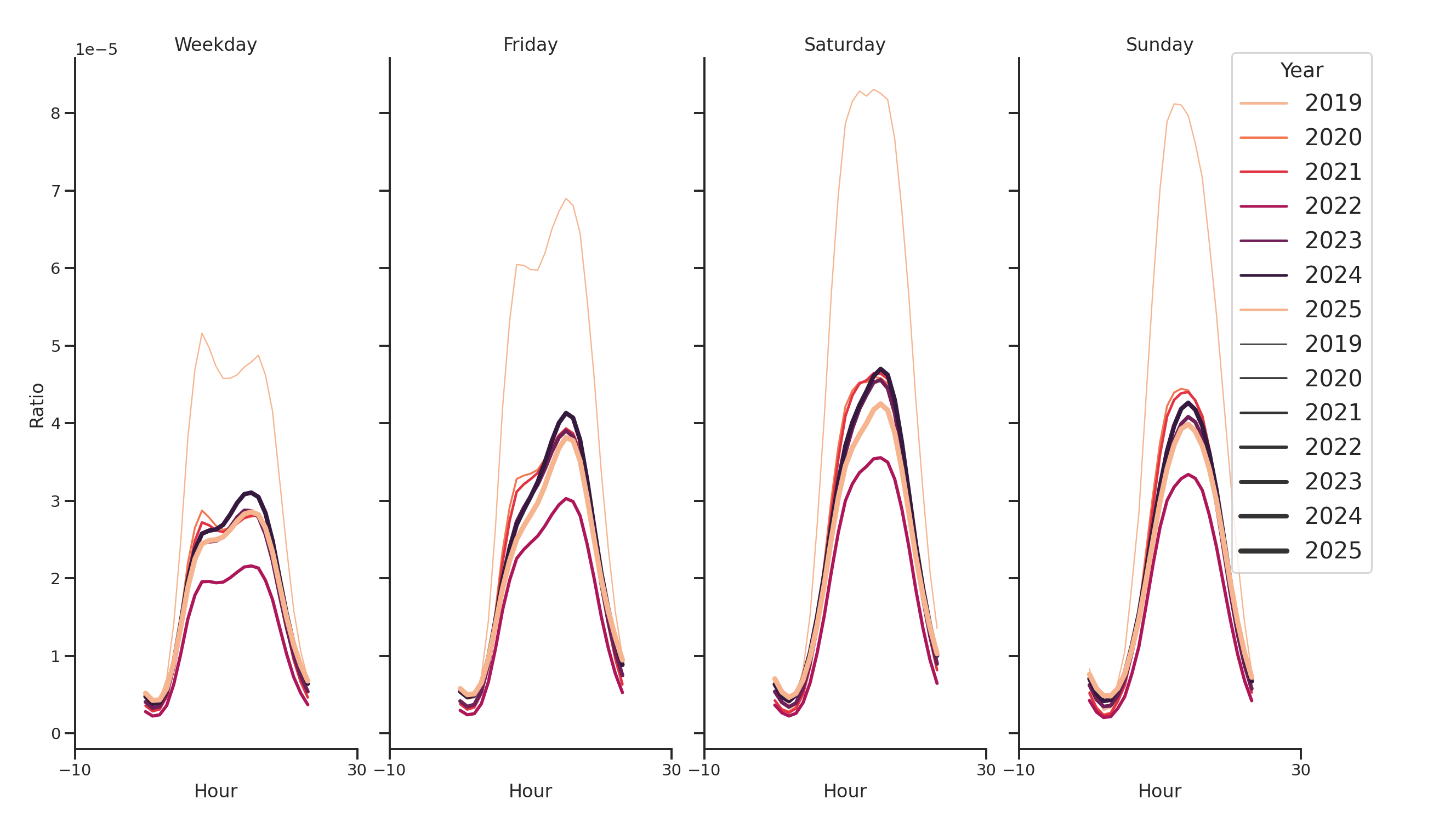 The figure below shows the average ratio of the weekly visits that fall within a specific hour of a specific day of the week. The color represents the year, and each band represents the variation over the months of the year.