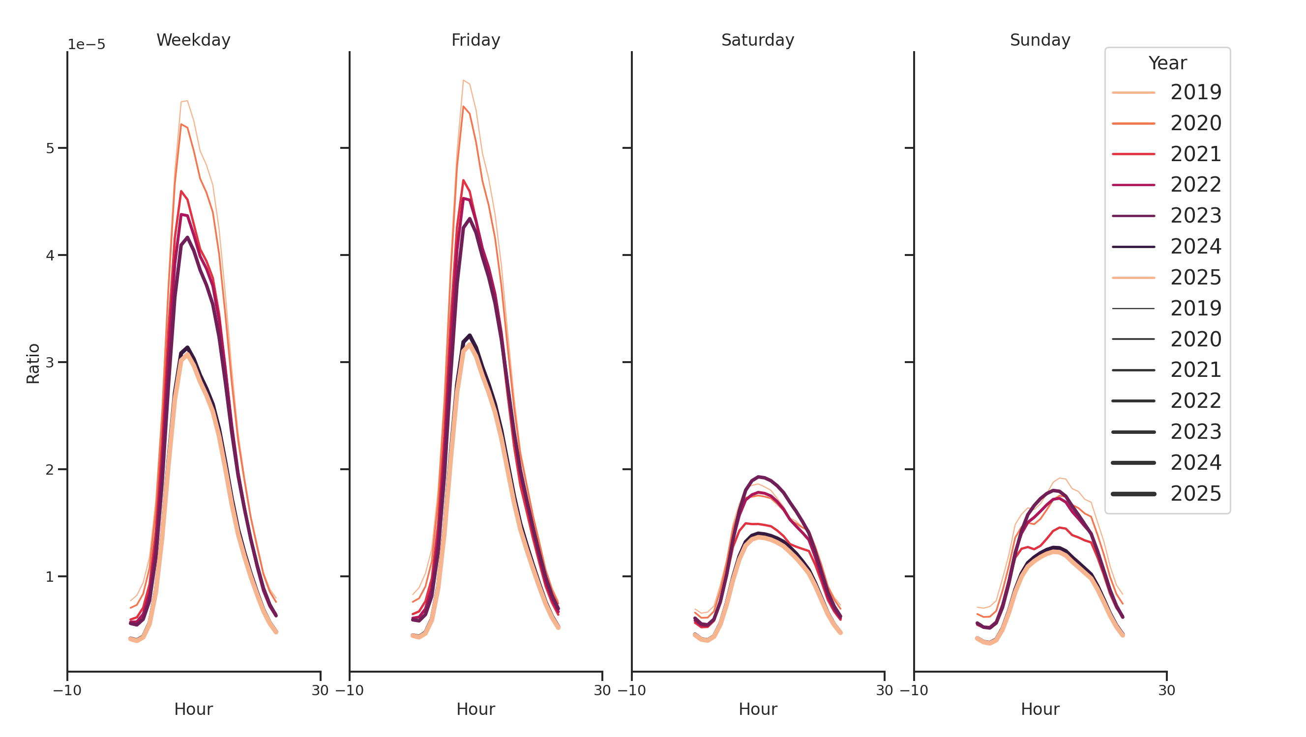 The figure below shows the average ratio of the weekly visits that fall within a specific hour of a specific day of the week. The color represents the year, and each band represents the variation over the months of the year.
