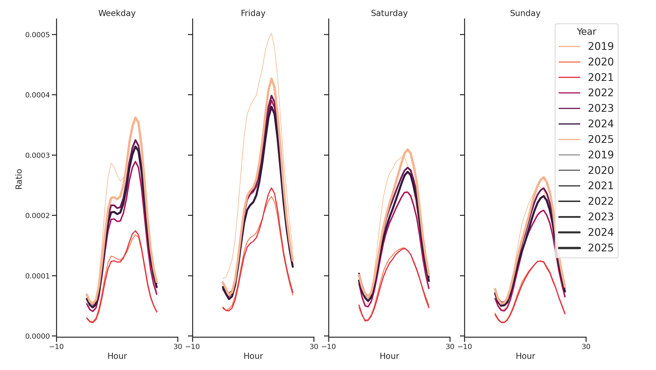 The figure below shows the average ratio of the weekly visits that fall within a specific hour of a specific day of the week. The color represents the year, and each band represents the variation over the months of the year.